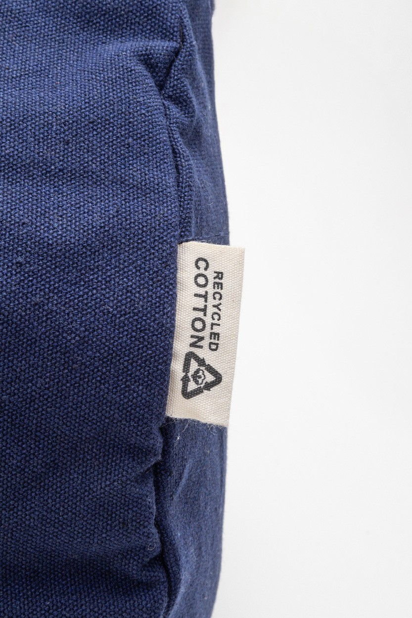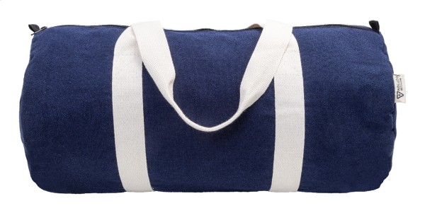 Geantă sport din pânză reciclată, cu compartiment principal cu fermoar, buzunar interior cu fermoar și mânere lungi. 70% bumbac reciclat și 30% poliester reciclat. Cu etichetă distinctivă din bumbac reciclat.