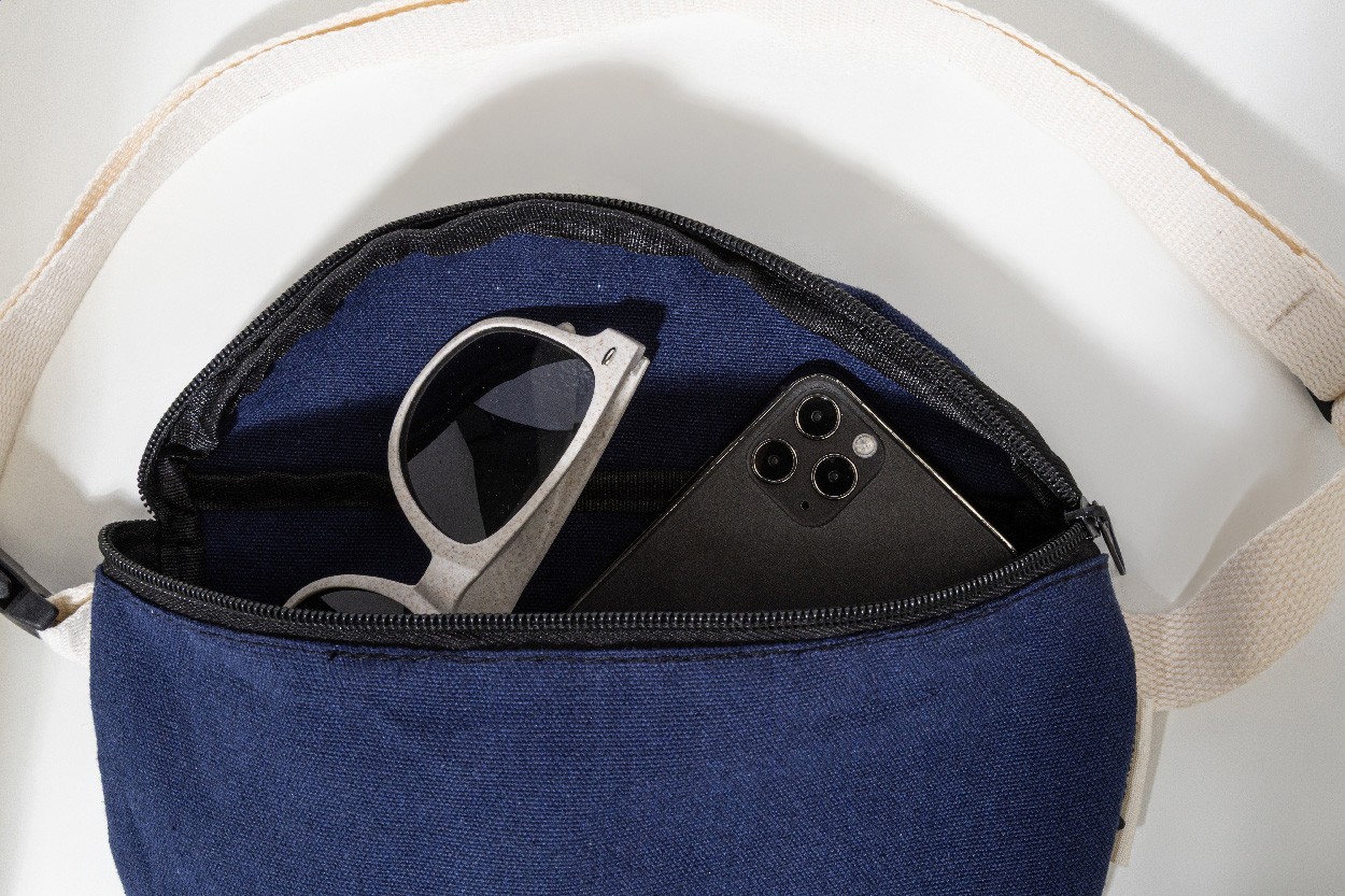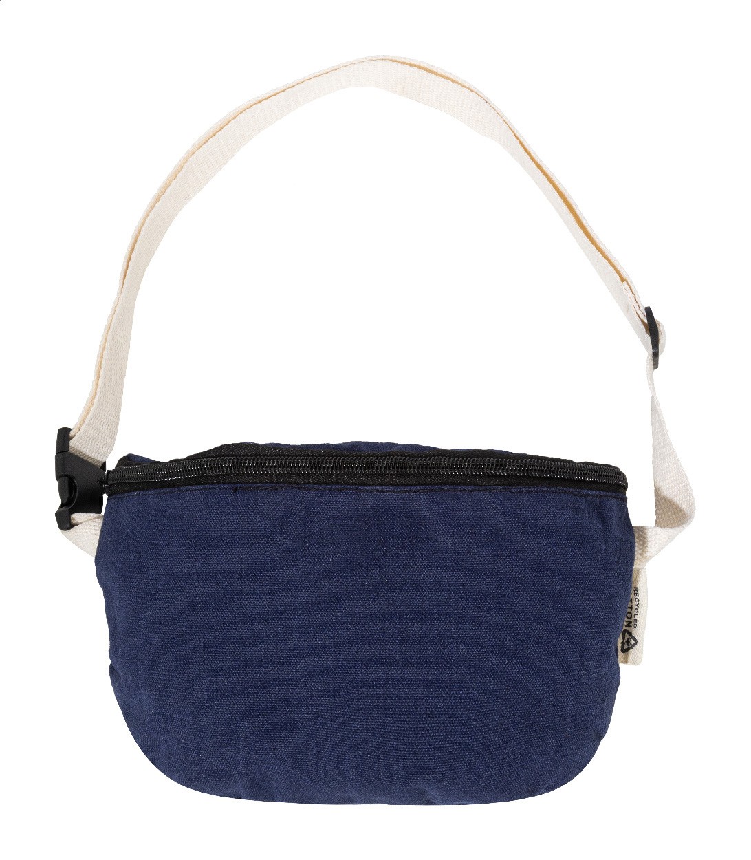 Borsetă din pânză reciclată, cu compartiment cu fermoar și curea reglabilă. 70% bumbac reciclat și 30% poliester reciclat. Cu etichetă distinctivă din bumbac reciclat.
