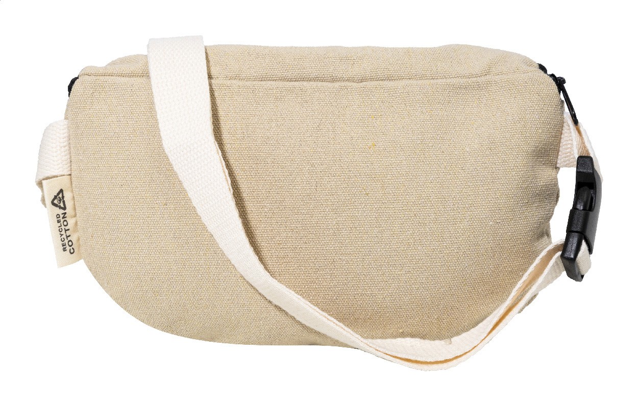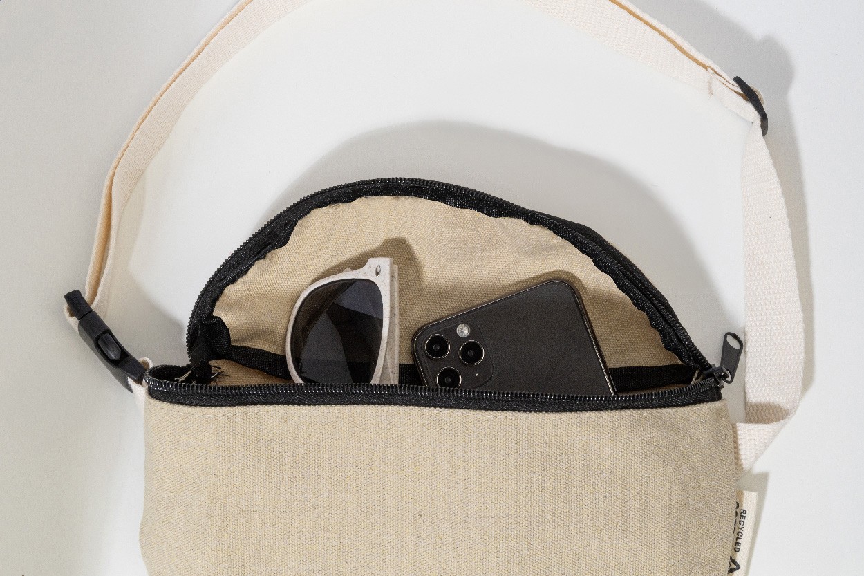 Borsetă din pânză reciclată, cu compartiment cu fermoar și curea reglabilă. 70% bumbac reciclat și 30% poliester reciclat. Cu etichetă distinctivă din bumbac reciclat.
