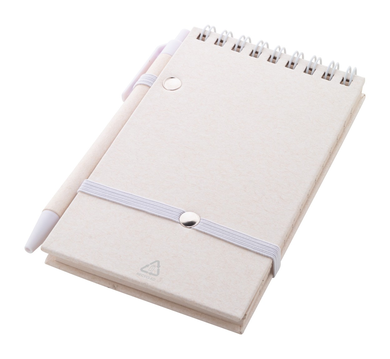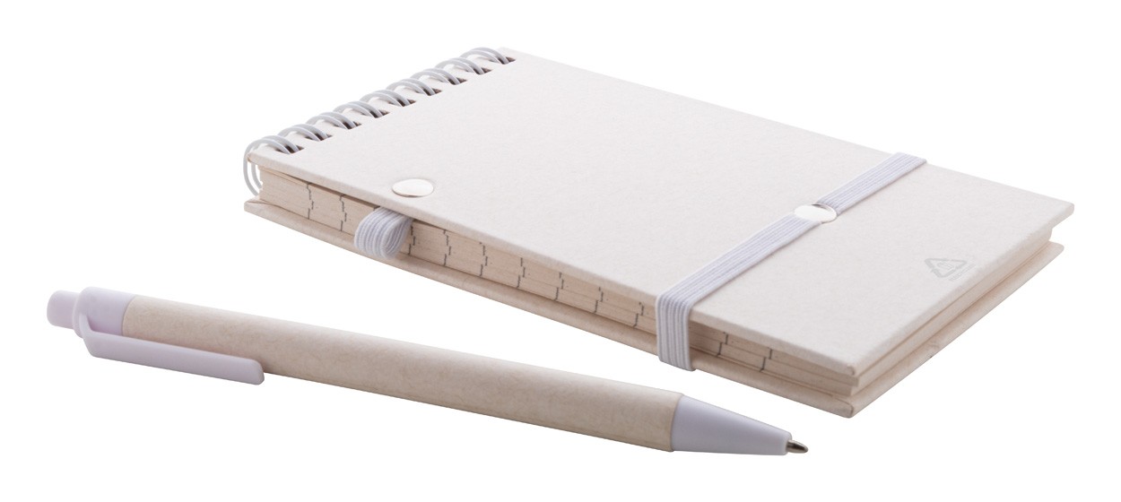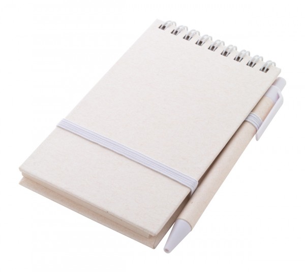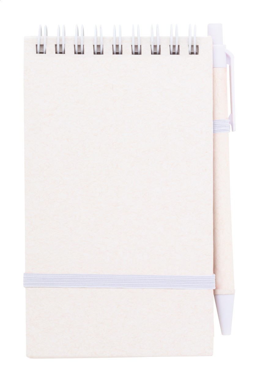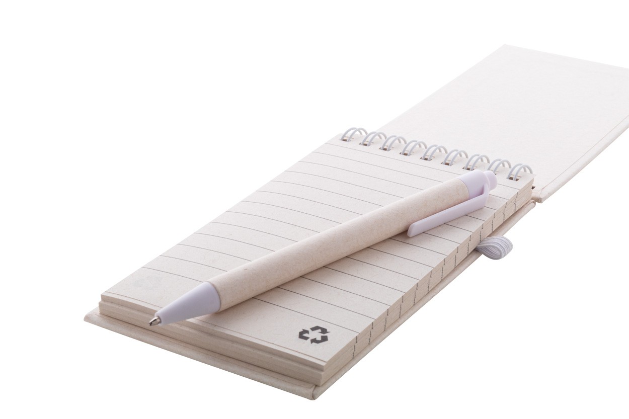 Caiet spiralat din hârtie din carton de lapte reciclat, cu coperta tare și 70 de foi dictando. Cu inele spiralate de culoare asortată, curea de cauciuc și suport pentru stilouri. Include hârtie din carton de lapte reciclat și pix din plastic ABS reciclat cu mină albastră. Dimensiune A6.