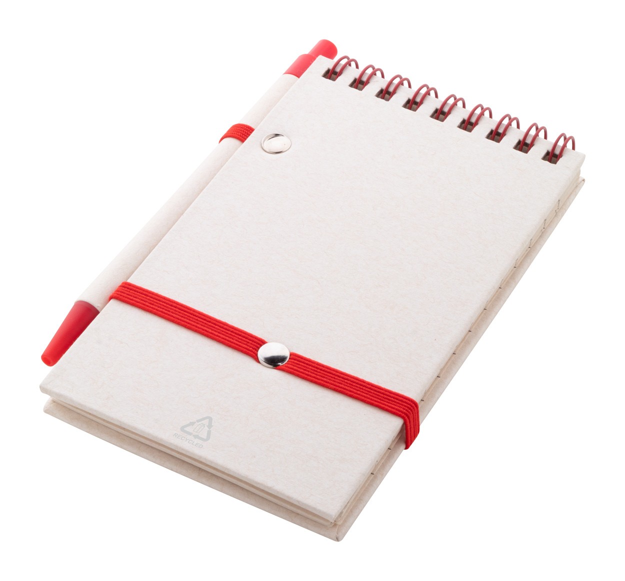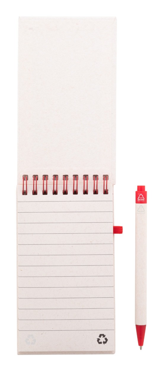 Caiet spiralat din hârtie din carton de lapte reciclat, cu coperta tare și 70 de foi dictando. Cu inele spiralate de culoare asortată, curea de cauciuc și suport pentru stilouri. Include hârtie din carton de lapte reciclat și pix din plastic ABS reciclat cu mină albastră. Dimensiune A6.