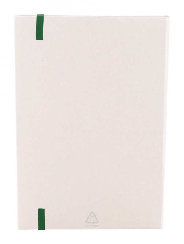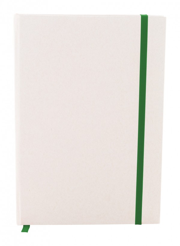Caiet din hârtie din carton de lapte reciclat, cu copertă rigidă, 80 de foi veline și bandă elastică de culoare asortată. Dimensiune A5.