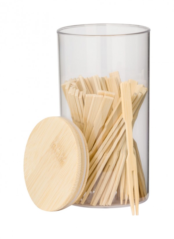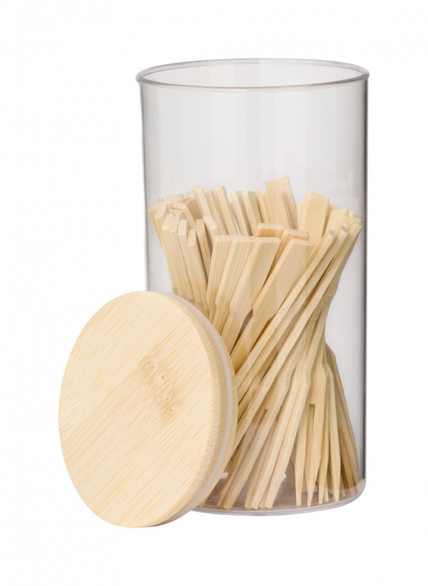 Set de furculițe din bambus pentru aperitiv, 50 buc în borcan de plastic cu capac din bambus