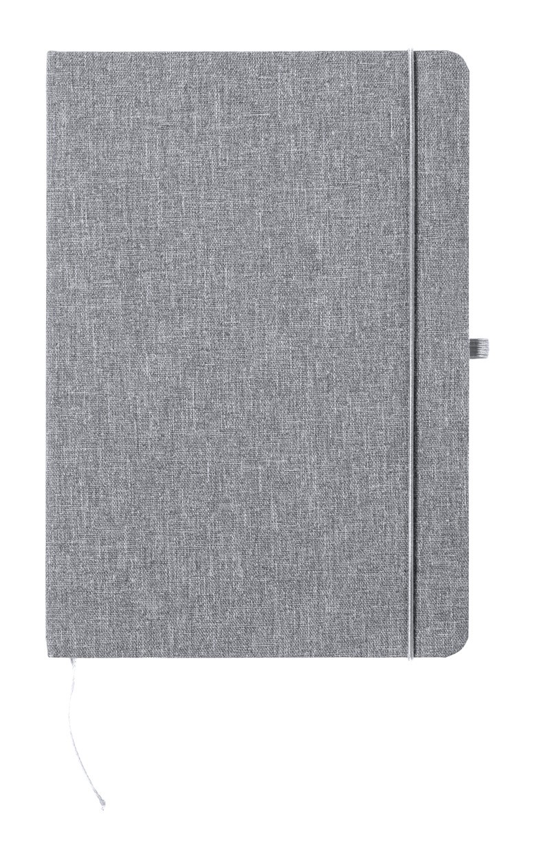 Caiet cu coperta din poliester 300D RPET, cu 80 de foi veline. Cu curea de cauciuc de culoare similară, marcaj și suport pentru pix. Dimensiune A5.