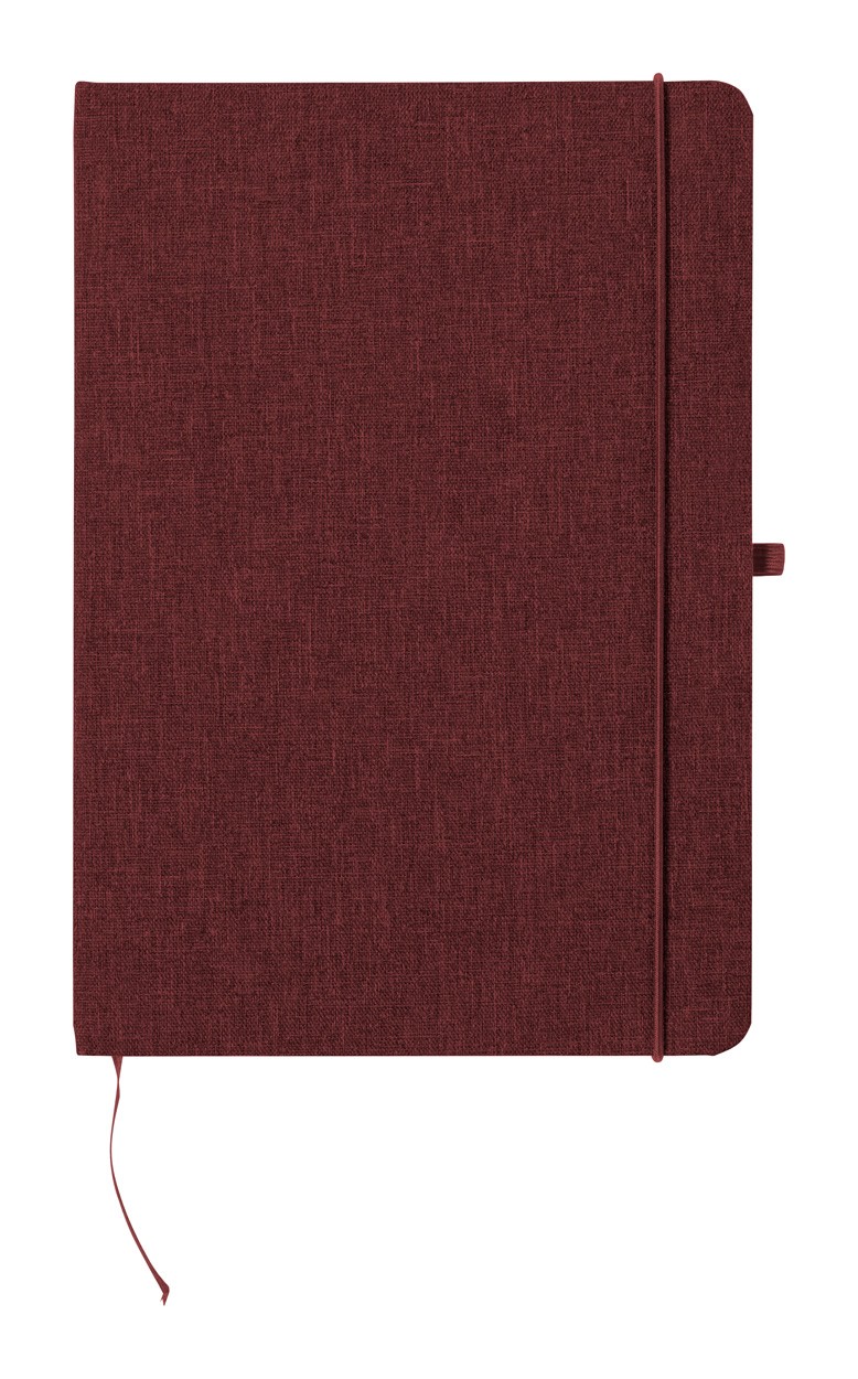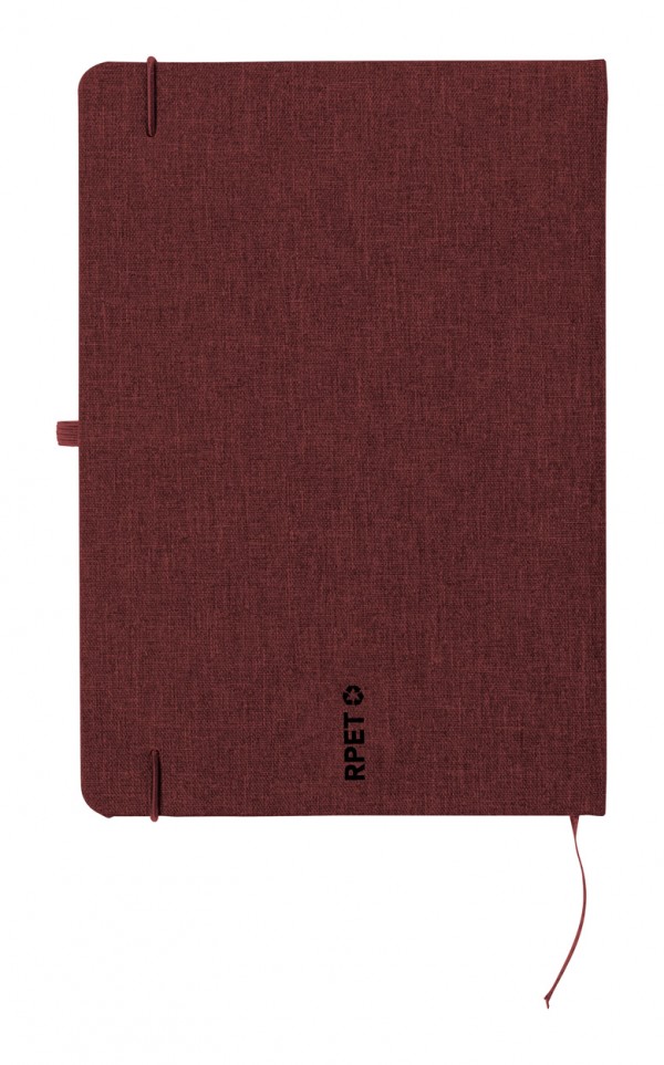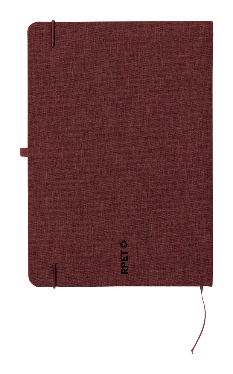 Caiet cu coperta din poliester 300D RPET, cu 80 de foi veline. Cu curea de cauciuc de culoare similară, marcaj și suport pentru pix. Dimensiune A5.