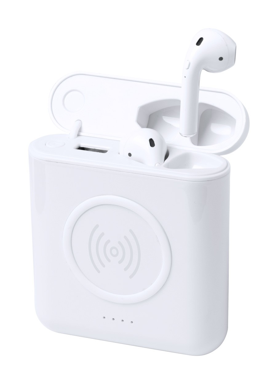 Bancă de alimentare USB din plastic cu baterie de 5000 mAh, încărcător wireless încorporat (5W) și căști stereo wireless adevărate (TWS) cu funcție de apelare mâini libere. Port de intrare USB-C. Inclusiv cablu de încărcare USB.