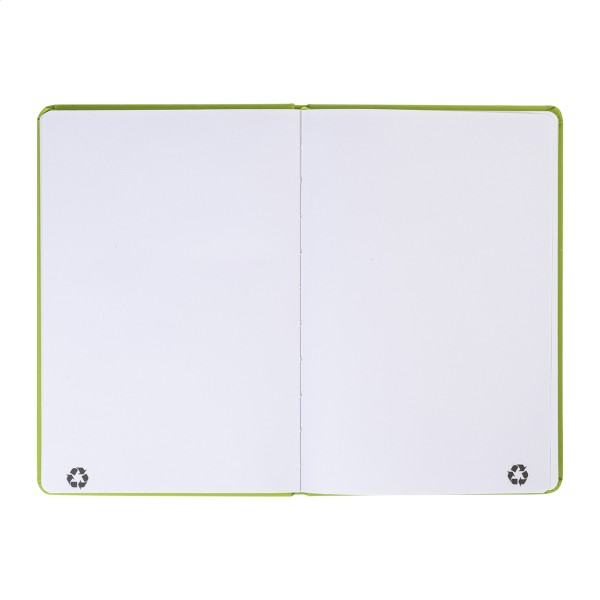 Caiet cu copertă din piele PU reciclată, cu 100 de foi veline din hârtie reciclată. Cu semn de carte de culoare asortată și bandă de cauciuc. Dimensiune A5.