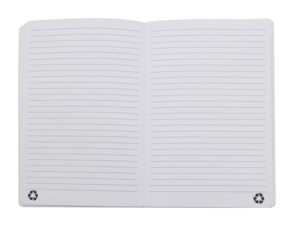 Caiet cu coperta din piele PU reciclată, moale, cu 80 de foi dictando, din hârtie reciclată. Cu semn de carte de culoare asortată și bandă de cauciuc. Dimensiune A5.