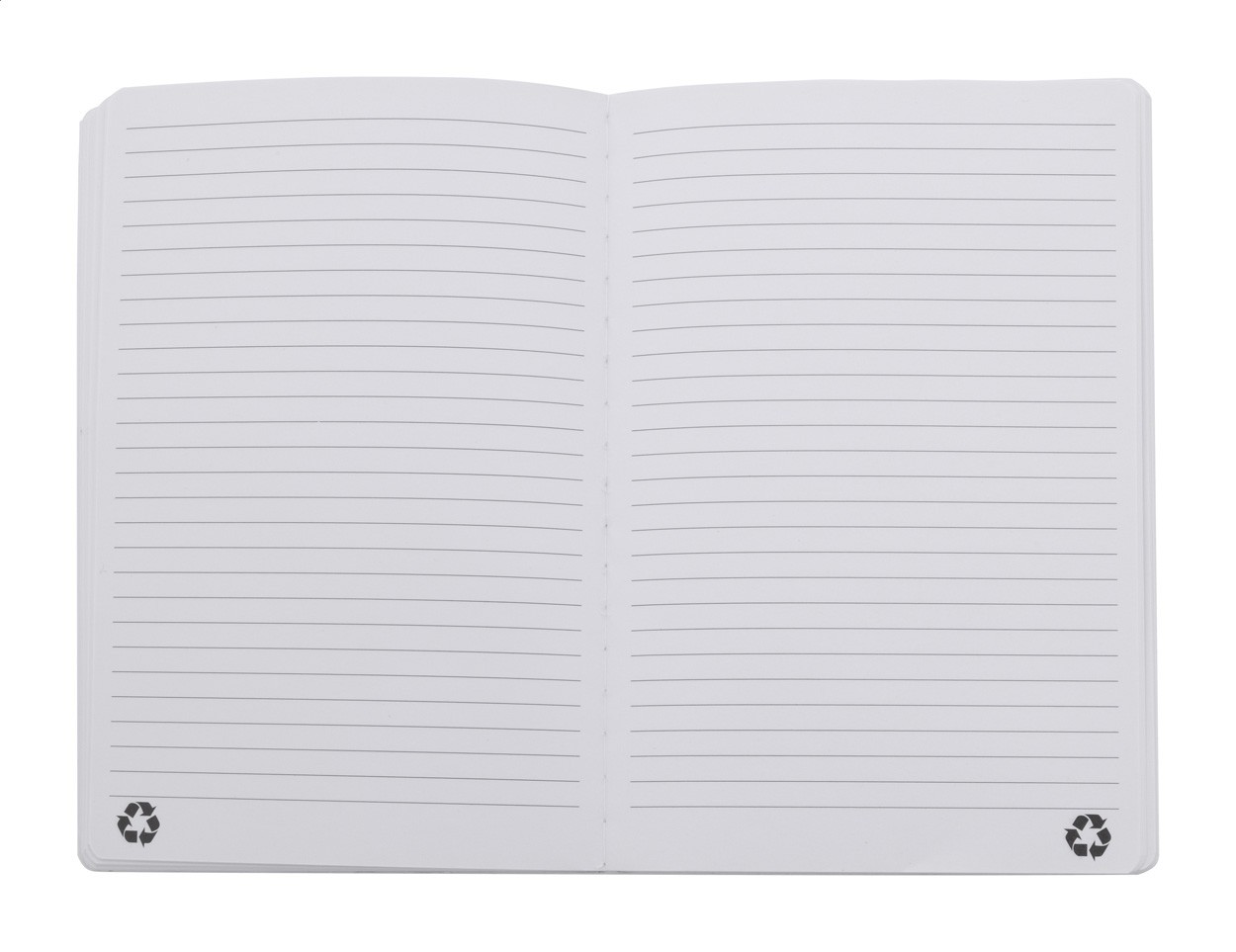 Caiet cu coperta din piele PU reciclată, moale, cu 80 de foi dictando, din hârtie reciclată. Cu semn de carte de culoare asortată și bandă de cauciuc. Dimensiune A5.