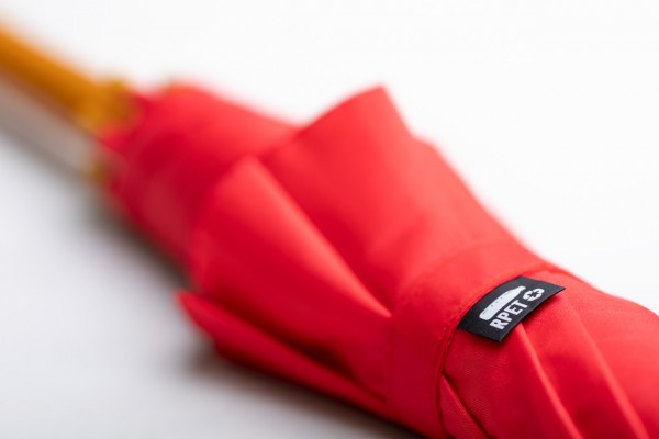 Umbrelă automată pliabilă, cu 8 panele. Cu cadru metalic, mâner din lemn. Material PET reciclat. Cu etichetă distinctă RPET.