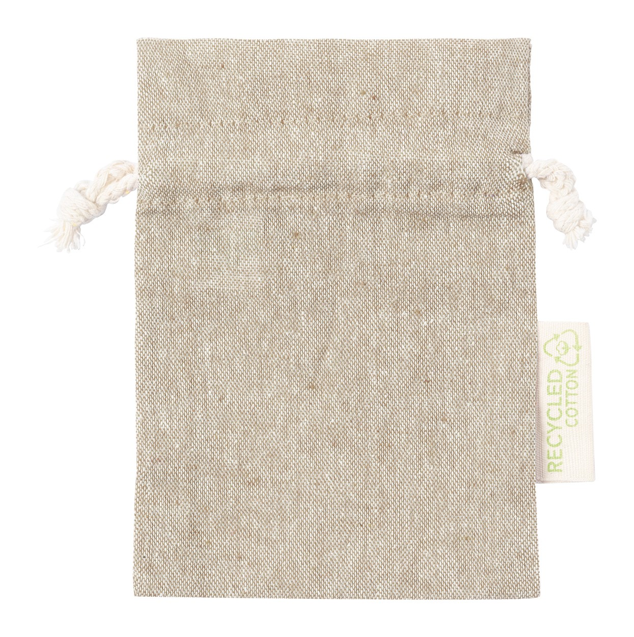 Săculeț pentru cadou, din bumbac reciclat, cu închidere cu șnur. Cu etichetă distinctivă din bumbac reciclat. 100% bumbac reciclat, 120 g/m².
