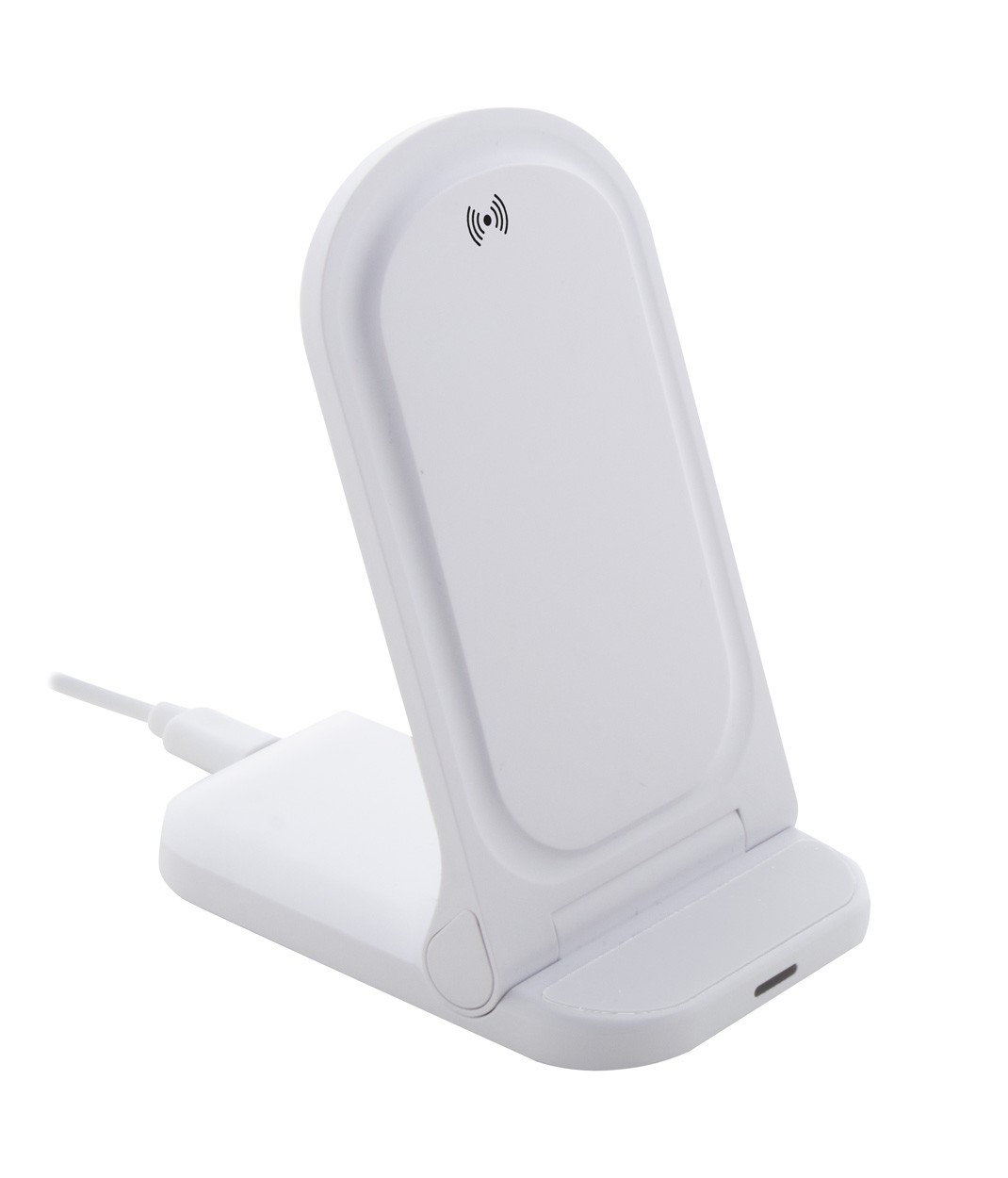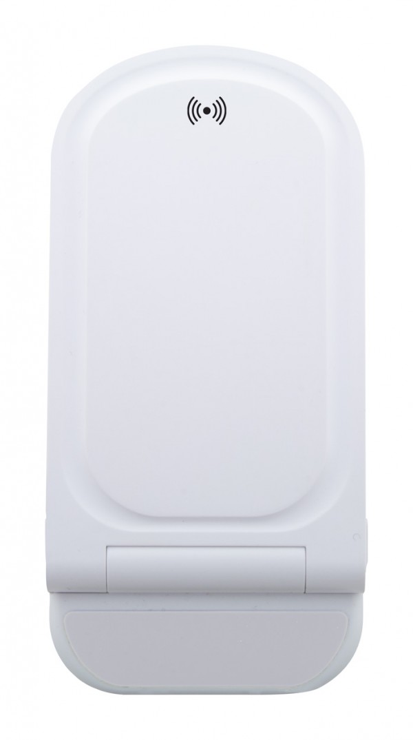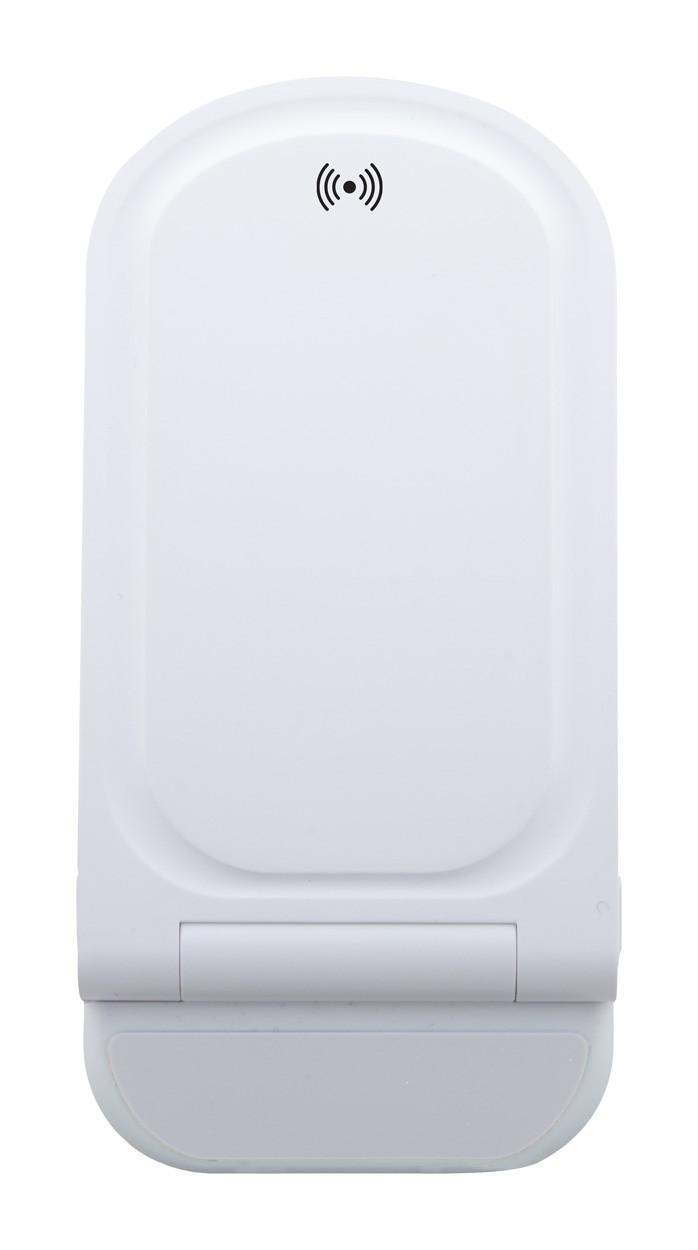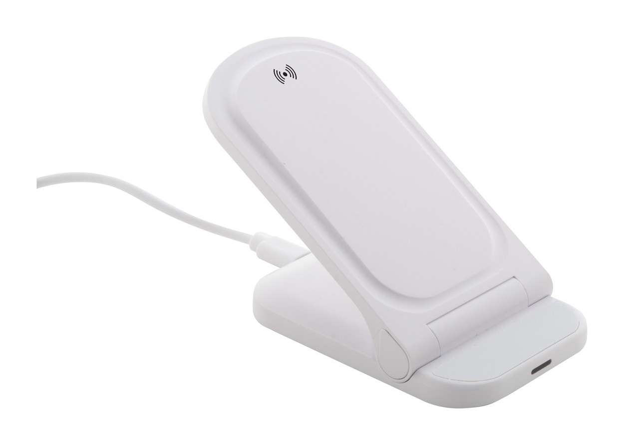 Suport telefon mobil de birou, pliabil, reglabil, din plastic ABS reciclat, cu încărcător rapid fără fir încorporat (15W). Inclusiv cablu de încărcare USB.