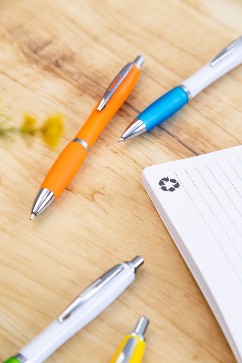 Pix din plastic ABS reciclat, cu cilindru alb, mâner colorat și părți cromate. Cu mină albastră.