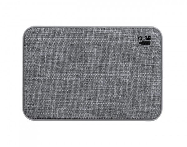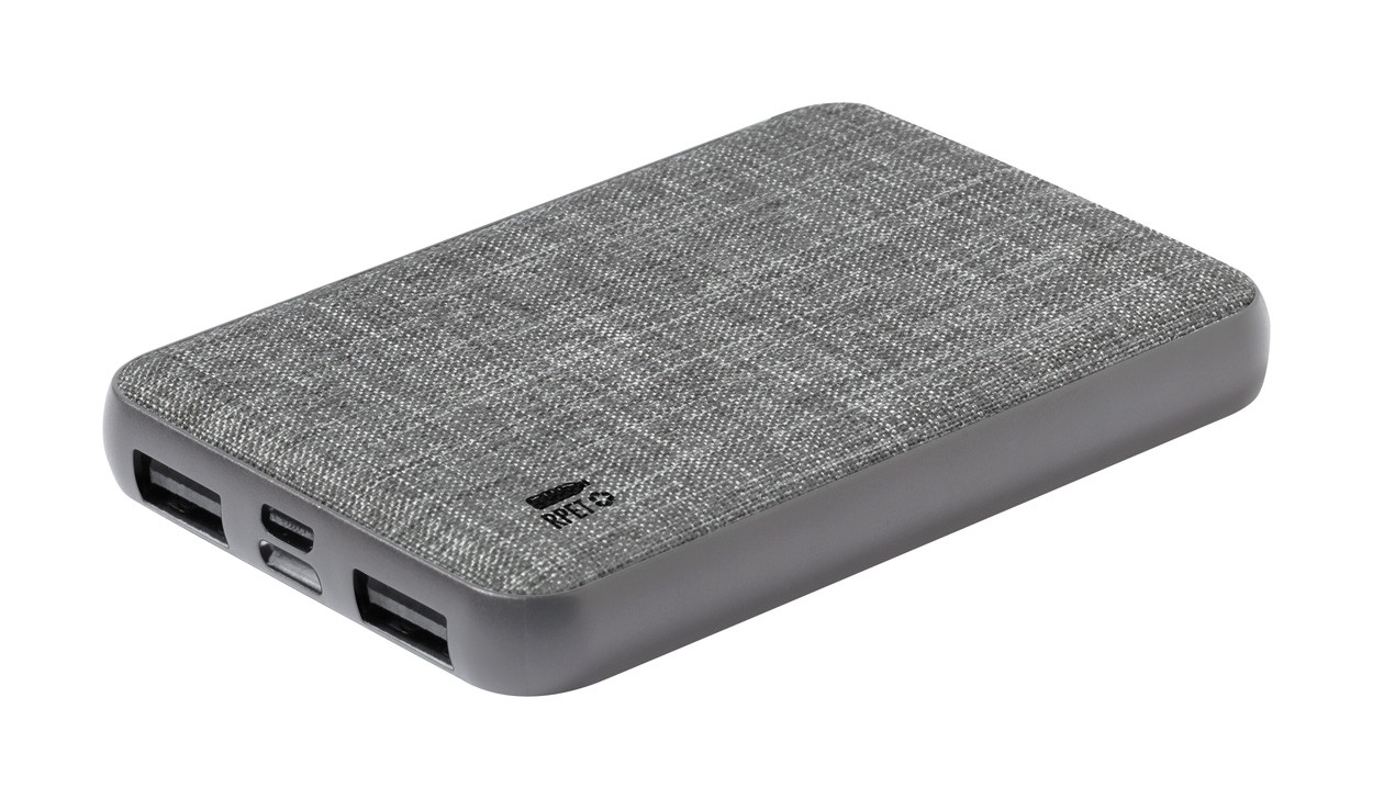 Powerbank USB din plastic RPET cu fața din material poliester RPET. Cu baterie de 5000 mAh, 2 porturi USB și 1 USB-C pentru încărcător. Porturi de intrare micro USB și USB-C. Inclusiv cablu de încărcare USB.