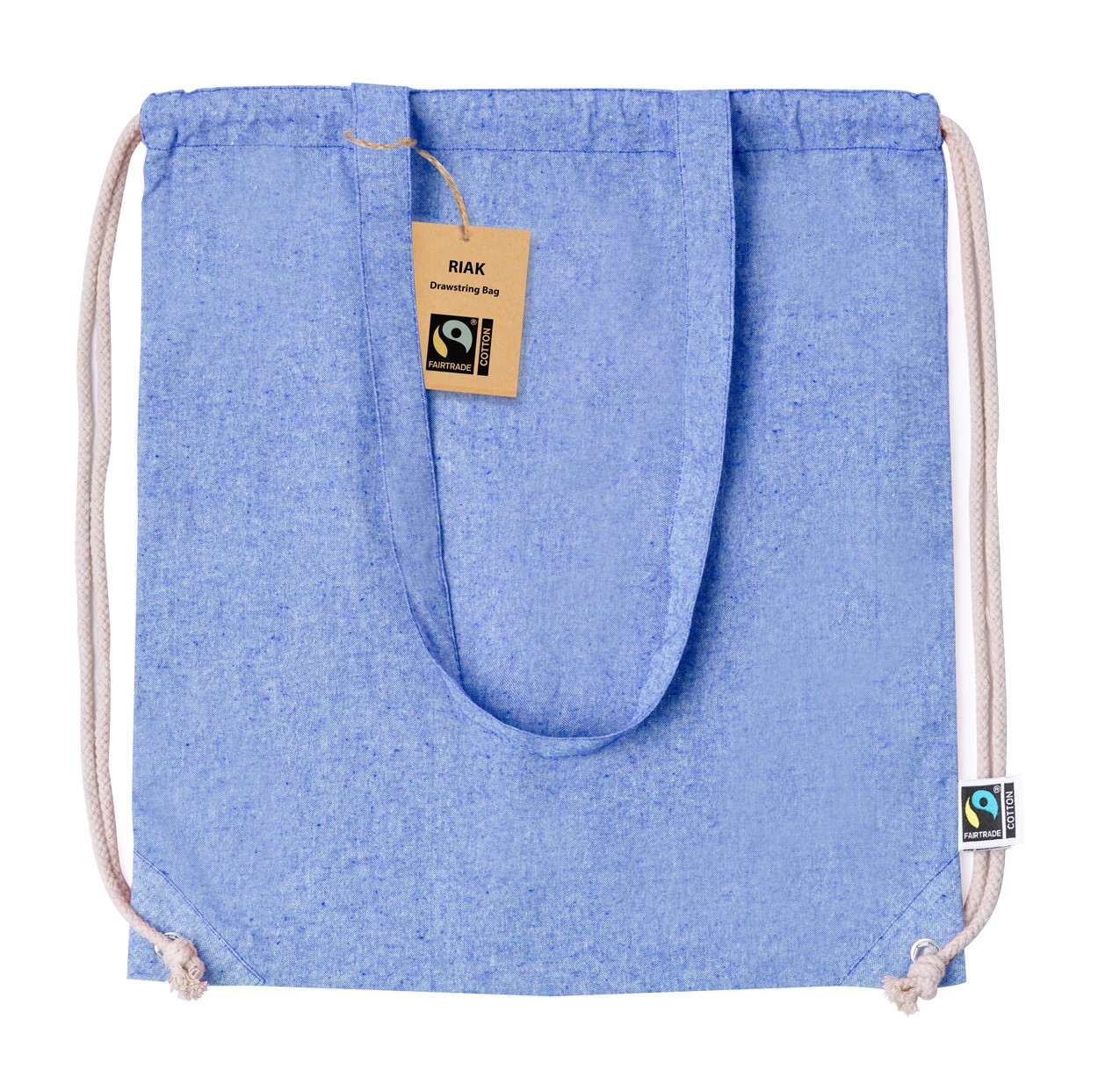 Geantă Fairtrade din bumbac reciclat, cu șnur, cu mânere lungi. Poate fi folosită și ca sacoșă de cumpărături. 100% bumbac Fairtrade, 140 g/m². Cu etichetă distinctă Fairtrade.