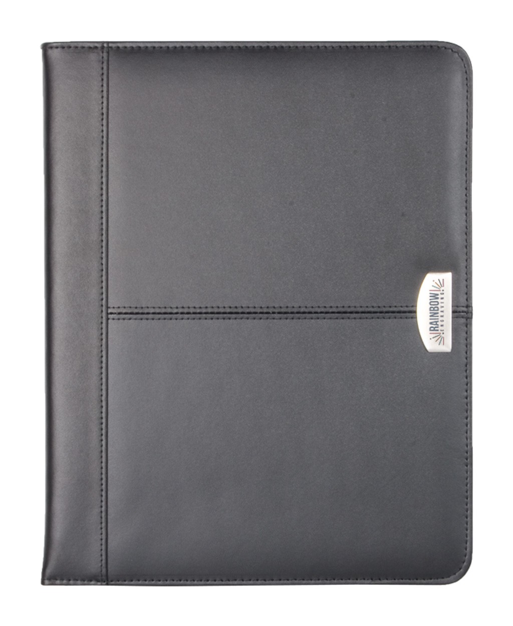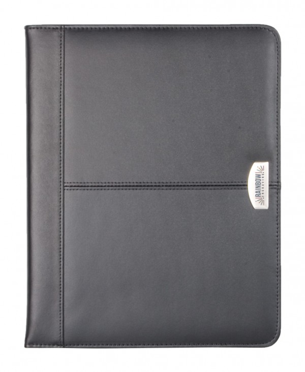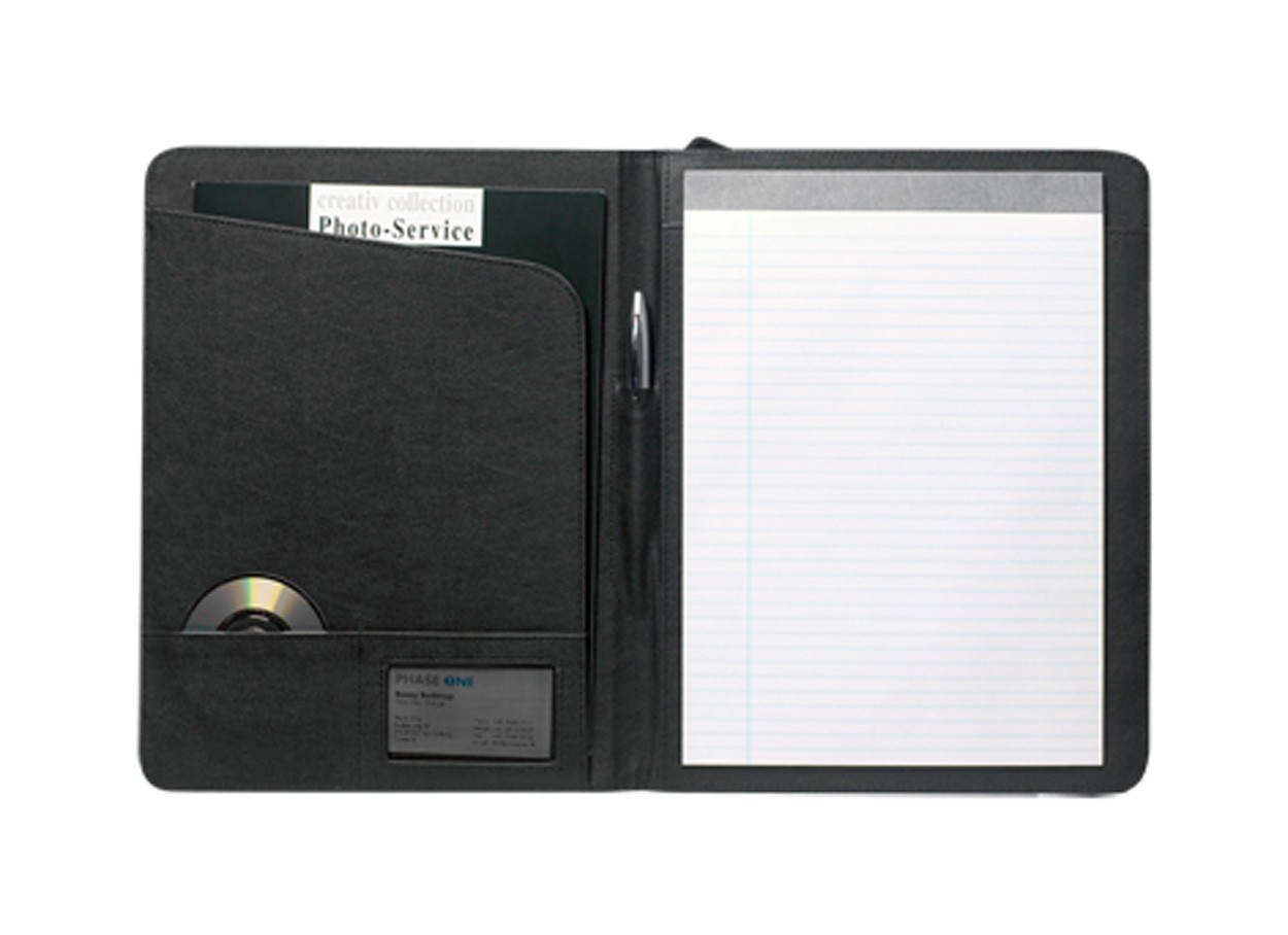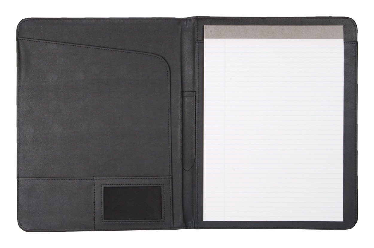 Mapă neagră din piele cu plăcuță metalică pe copertă. Carnețel dictando, compartiment separat pentru acte, suport pentru cărți de vizită și pix.