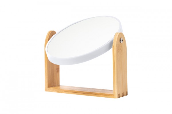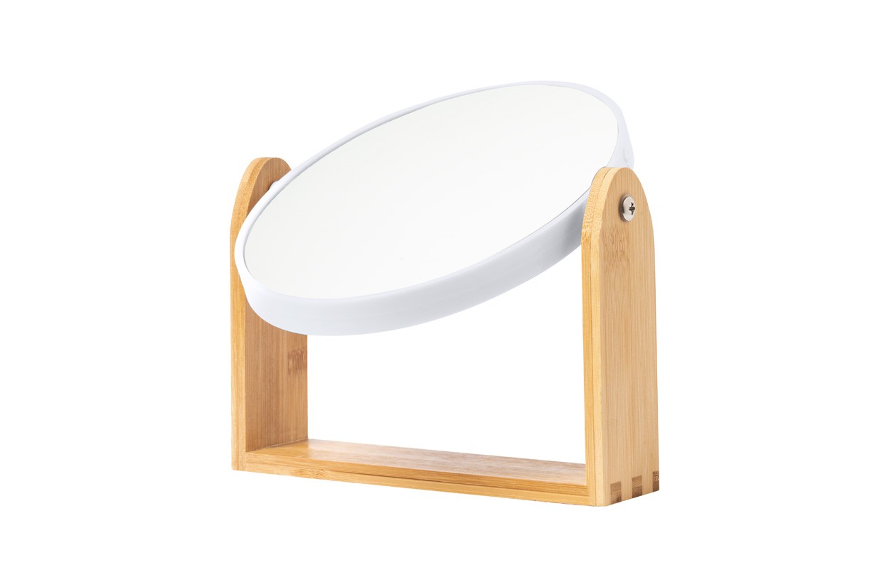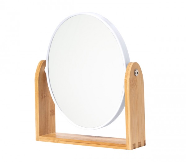 Oglindă de machiaj rotativă cu două fețe (1×/3× mărire) cu suport de masă din bambus. Ideal pentru masa de toaleta sau baie.