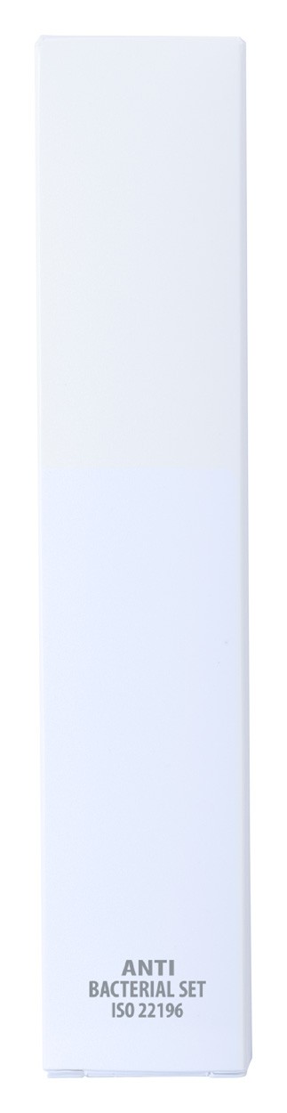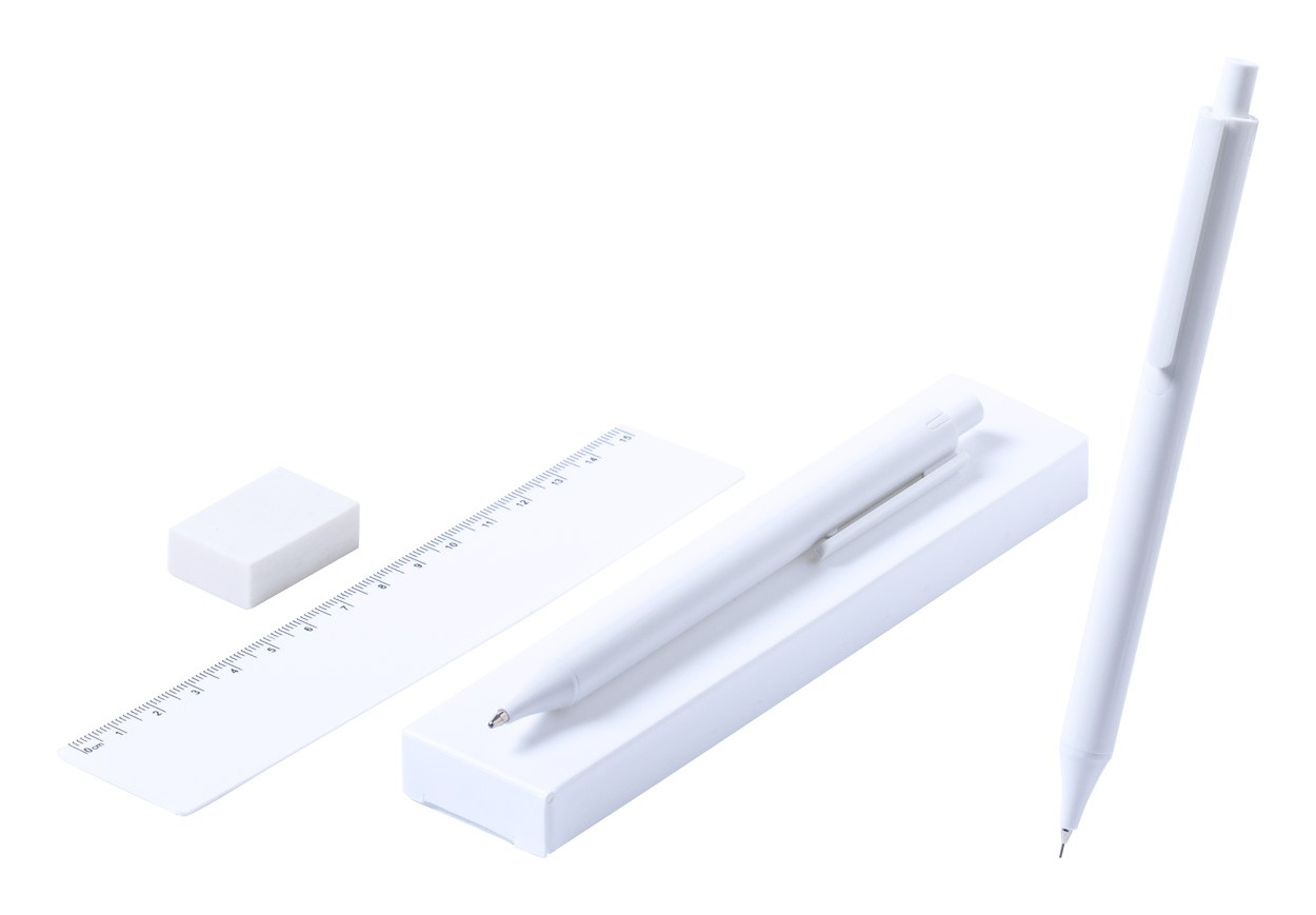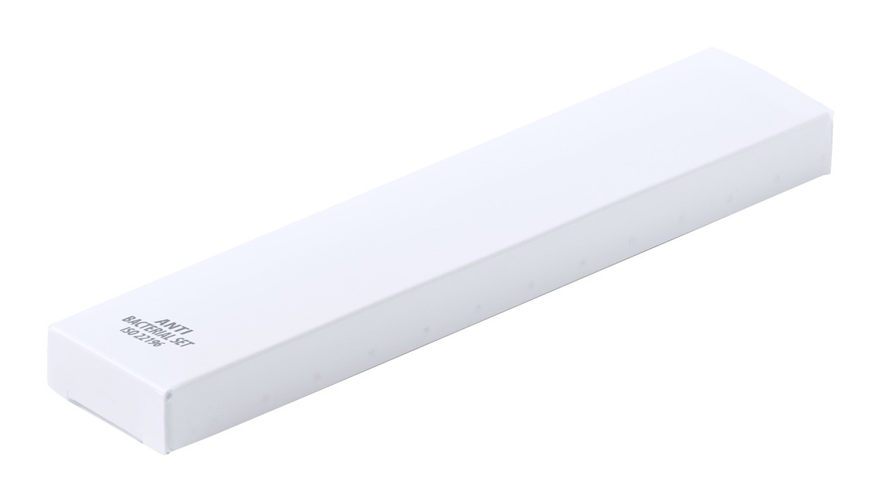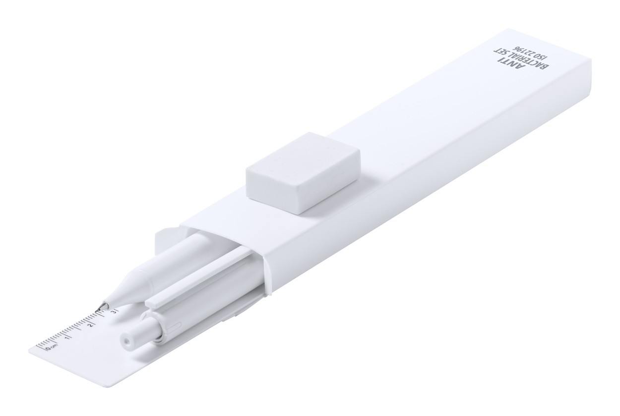 Set papetărie antibacterian, 4 piese, în cutie de plastic. Include : Pix din plastic (mină albastră ), creion mecanic, riglă și gumă de șters. Conform ISO 22196.