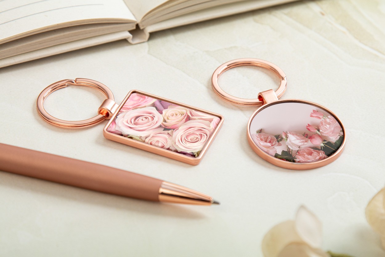 Breloc din metal, de formă dreptunghiulară, cu finisaj auriu, cu placă din metal. În cutie de hârtie kraft.