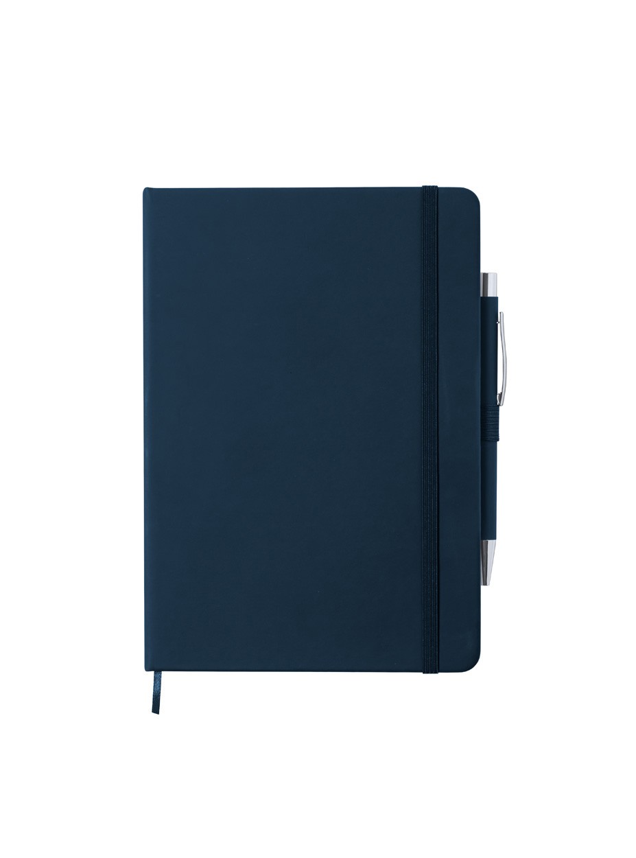 Carnet acoperit cu piele PU cu 100 de foi liniate, curea elastică, semn de carte și suport pentru stilou. Inclusiv un stilou din aluminiu cu finisaj cauciucat și reumplere albastră.