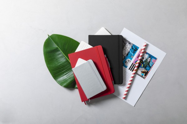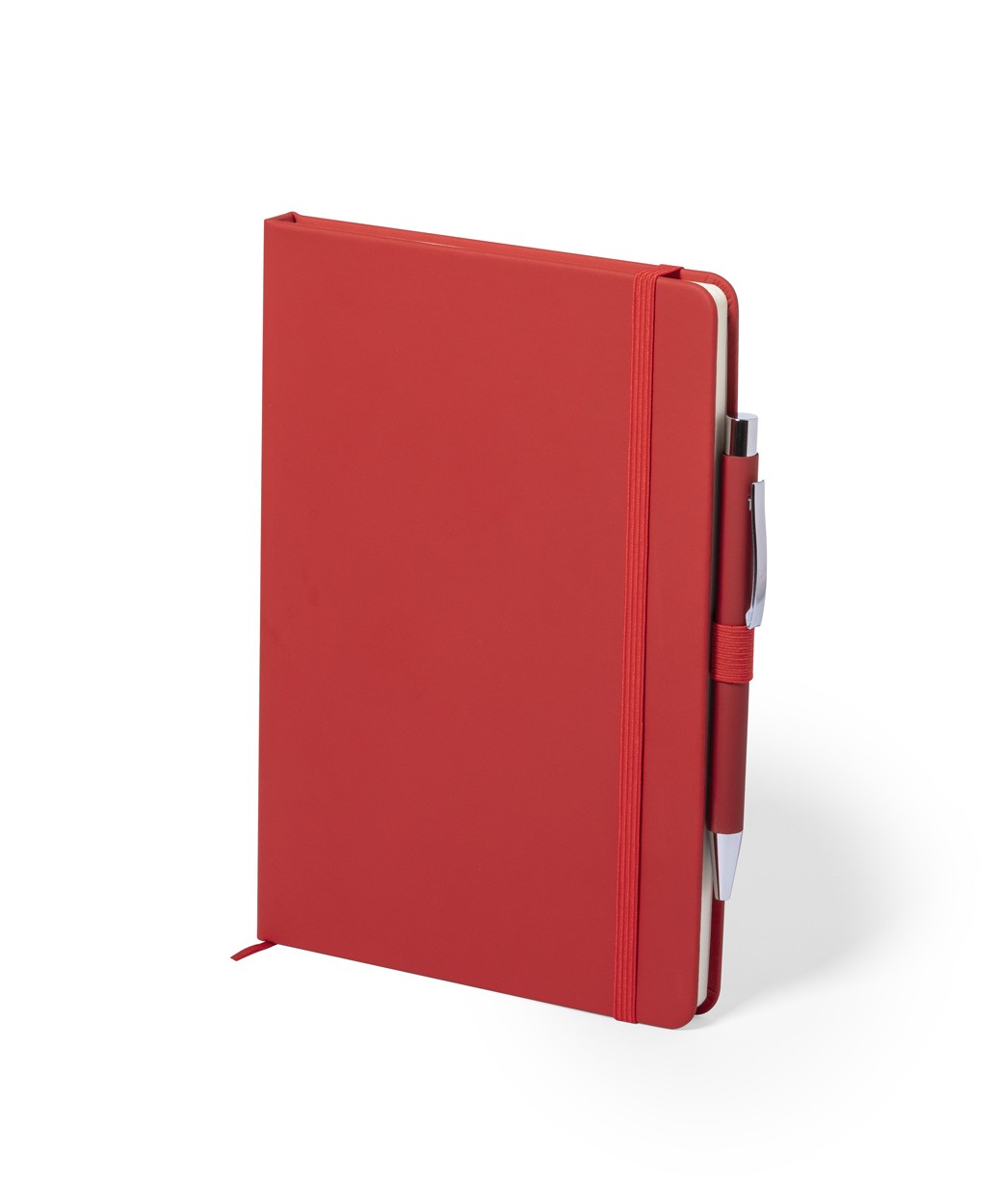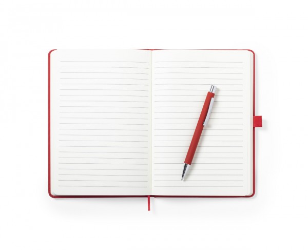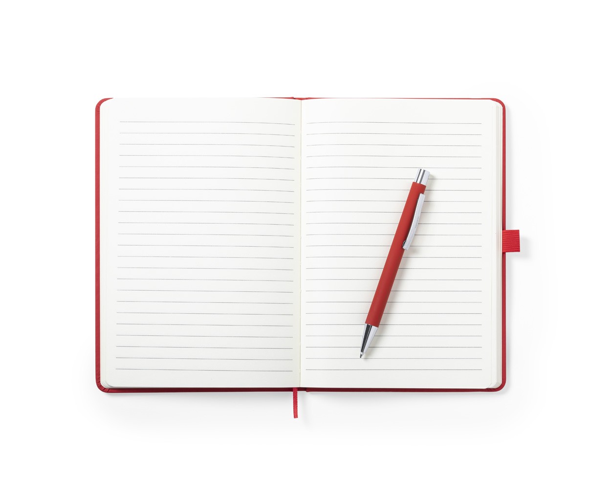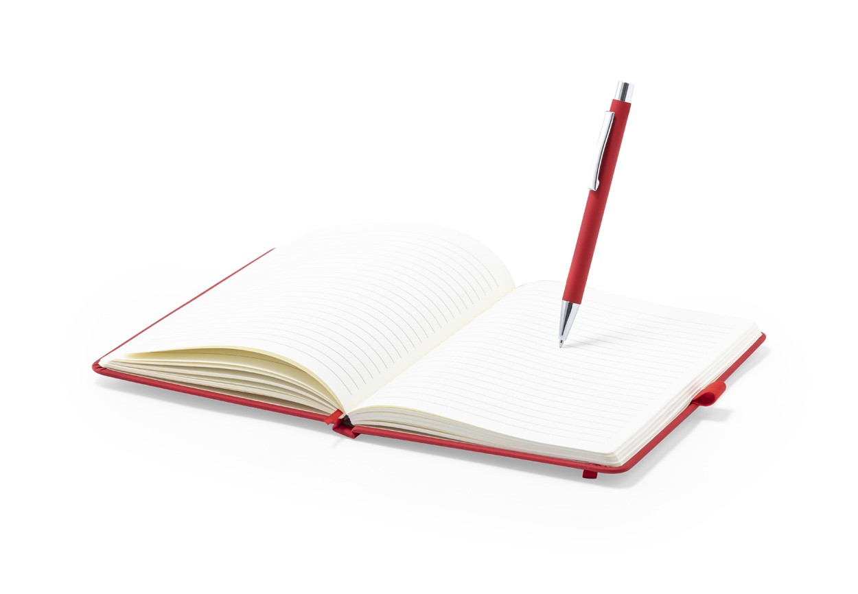 Carnet acoperit cu piele PU cu 100 de foi liniate, curea elastică, semn de carte și suport pentru stilou. Inclusiv un stilou din aluminiu cu finisaj cauciucat și reumplere albastră.