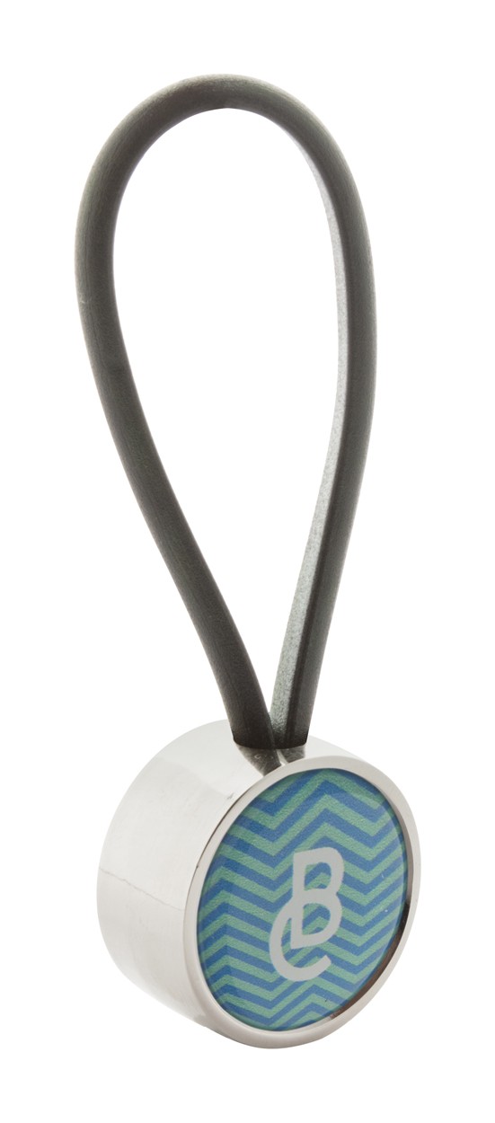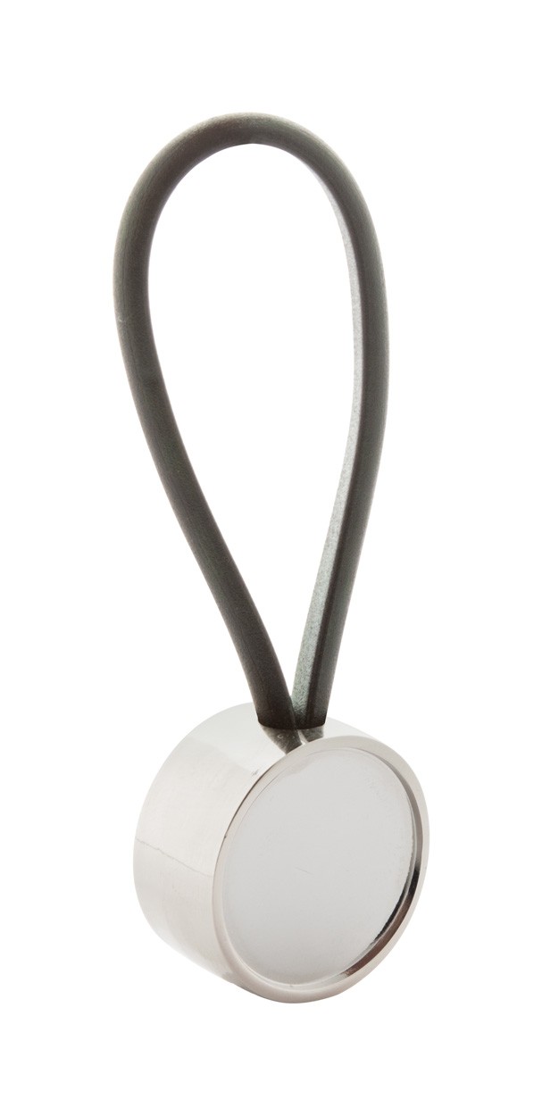 Breloc rotund din metal cu bandă din cauciuc negru.