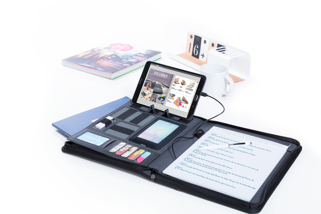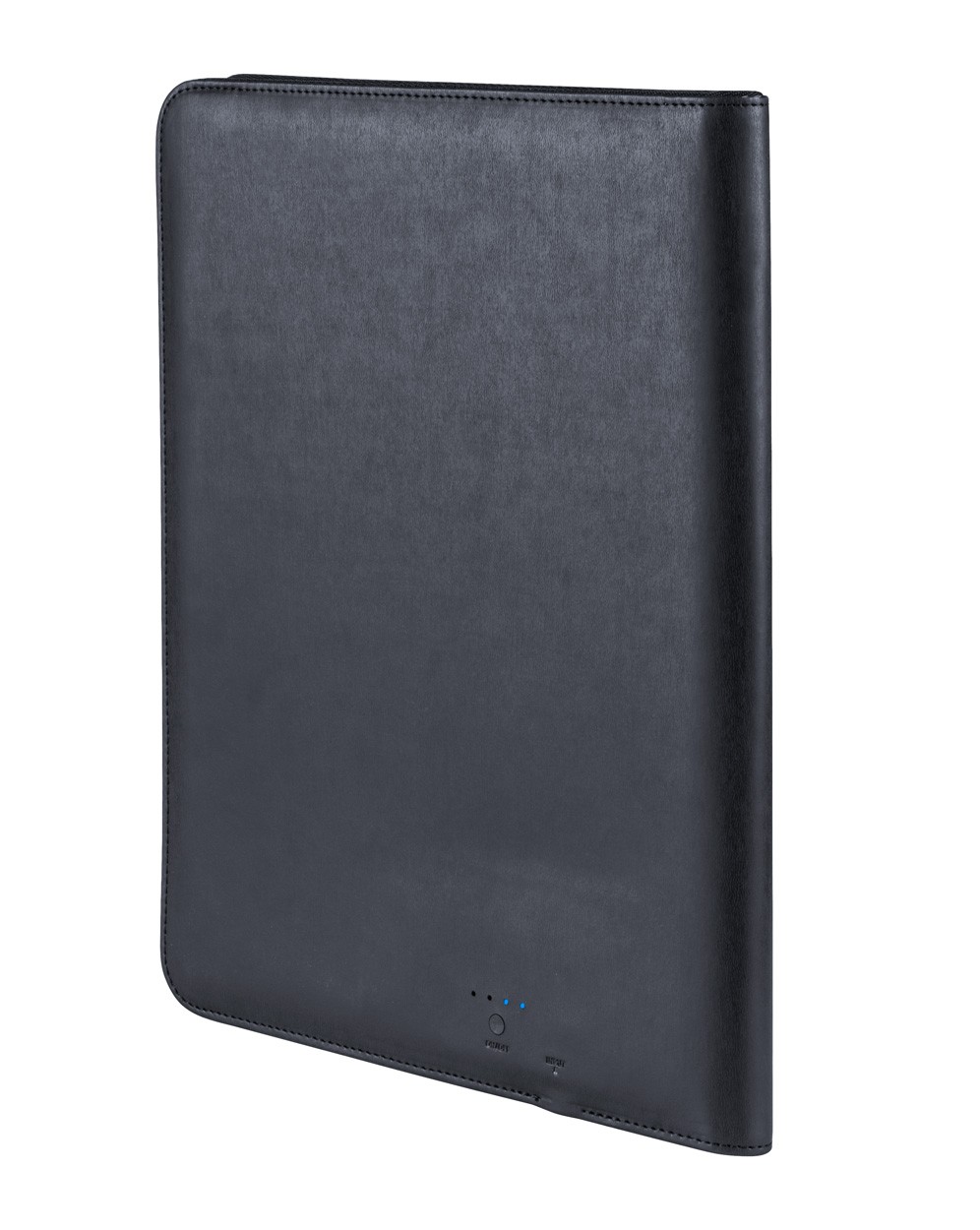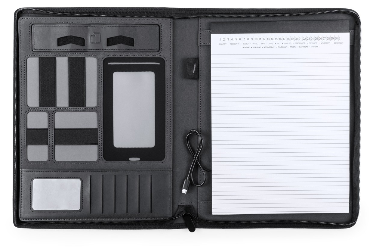 Mapă documente din înlocuitor piele, cu power bank de 5000 mAh, carnețel cu 20 de coli, suport pentru telefon mobil și tabletă și cablu de încărcare USB.