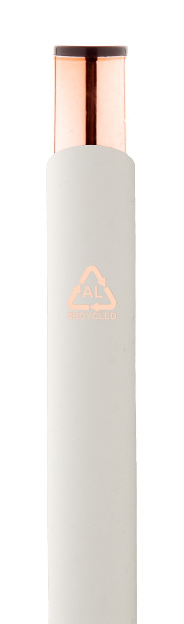 Pix din aluminiu reciclat, cu finisaj cauciucat și detalii auriu roz. Cu acoperire specială pentru gravarea laser în oglindă în culoarea aur roz. Cu mină albastră.