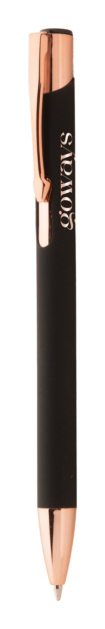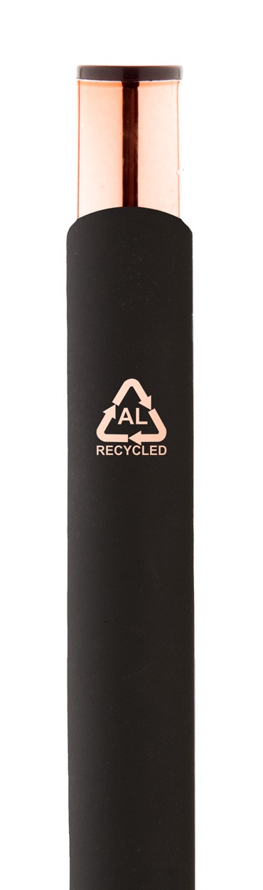 Pix din aluminiu reciclat, cu finisaj cauciucat și detalii auriu roz. Cu acoperire specială pentru gravarea laser în oglindă în culoarea aur roz. Cu mină albastră.