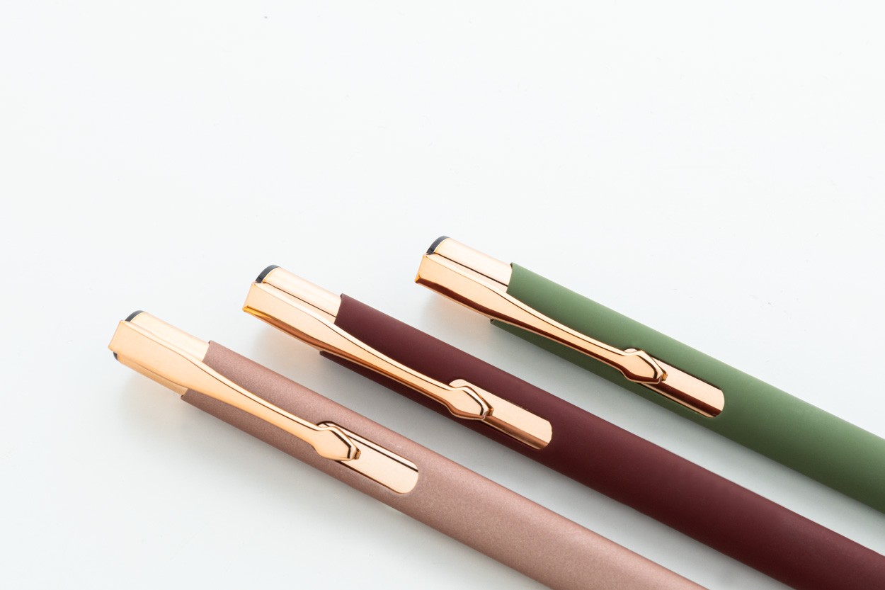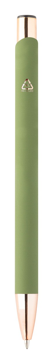 Pix din aluminiu reciclat, cu finisaj cauciucat și detalii auriu roz. Cu acoperire specială pentru gravarea laser în oglindă în culoarea aur roz. Cu mină albastră.