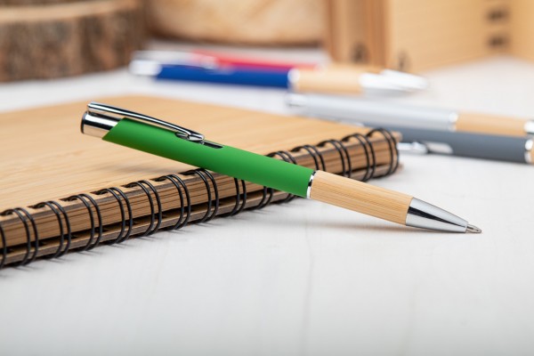 Pix din aluminiu, cu corp din bambus, finisaj cauciucat și mină albastră. Cu acoperire specială pentru gravarea laser în oglindă.