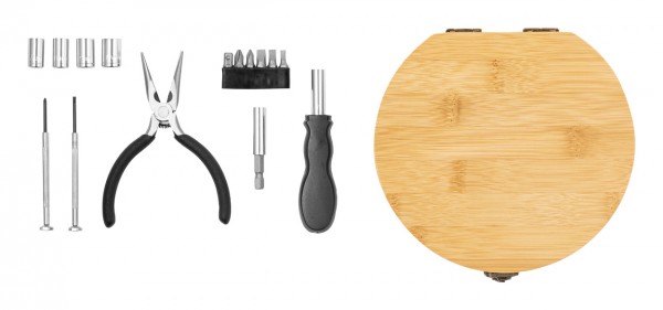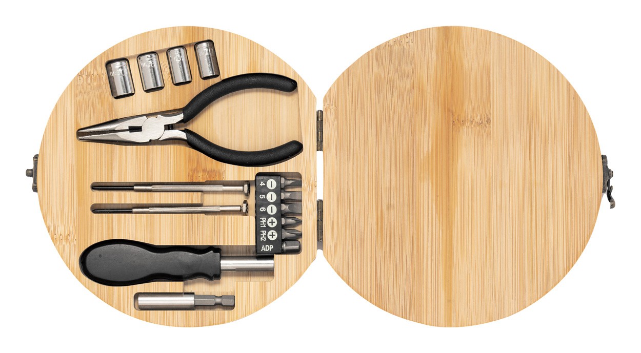 Set de scule, 15 buc în cutie de bambus cu închidere metalică.