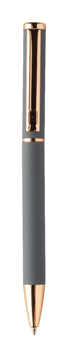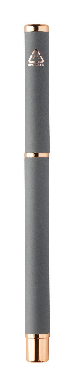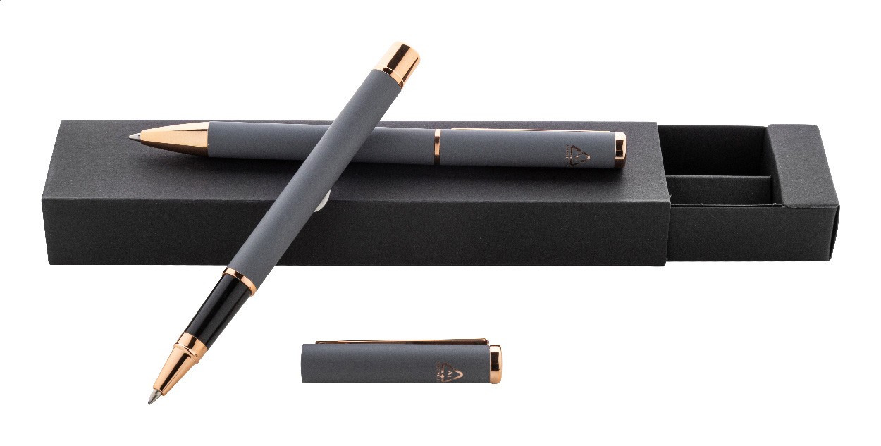 Set pixuri din aluminiu reciclat, cu pix cu bilă și roller, cu finisaj cauciucat și detalii auriu-roz. Cu mină albastră. Cu strat special pentru gravare laser în oglindă, de culoare auriu-roz. În cutie cadou din hârtie neagră.