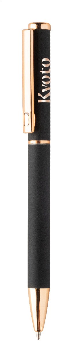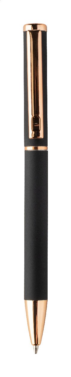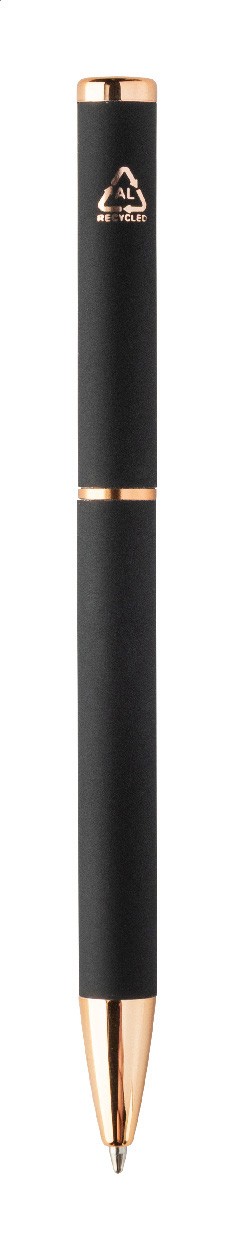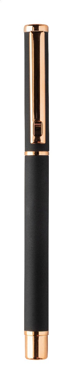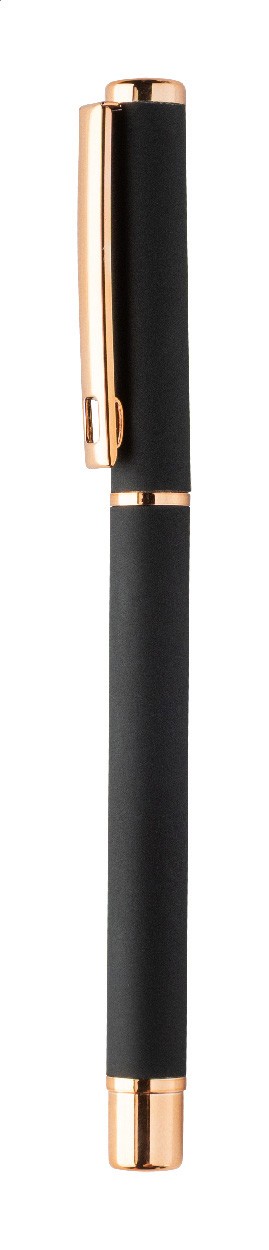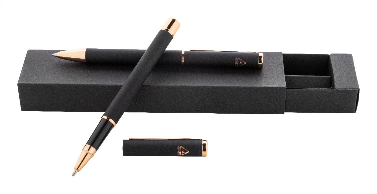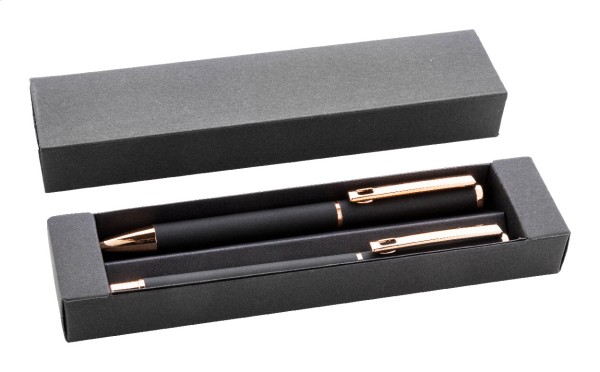 Set pixuri din aluminiu reciclat, cu pix cu bilă și roller, cu finisaj cauciucat și detalii auriu-roz. Cu mină albastră. Cu strat special pentru gravare laser în oglindă, de culoare auriu-roz. În cutie cadou din hârtie neagră.