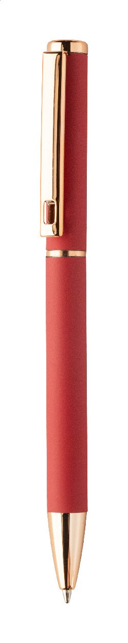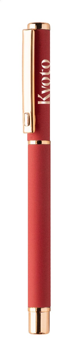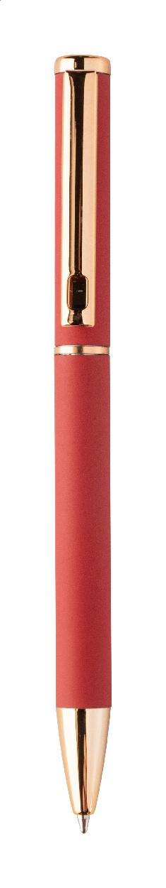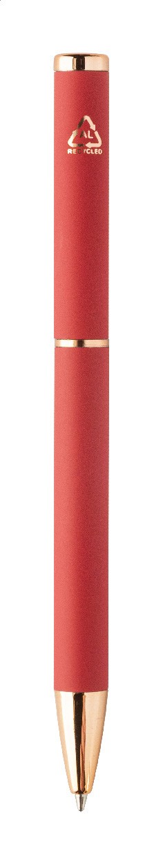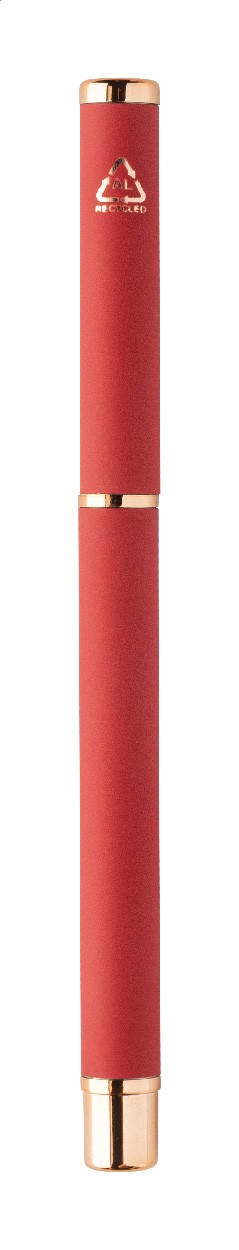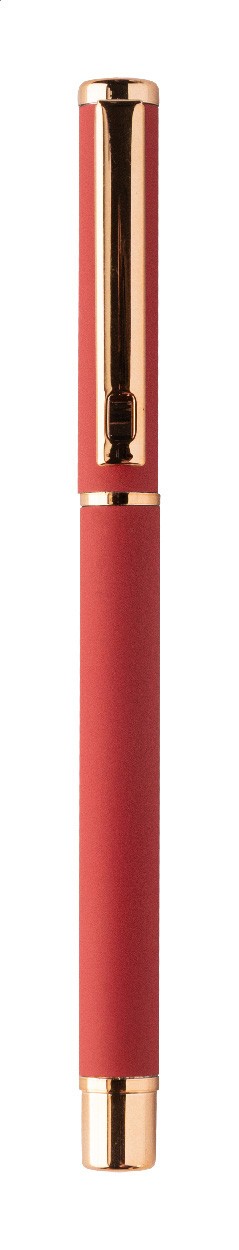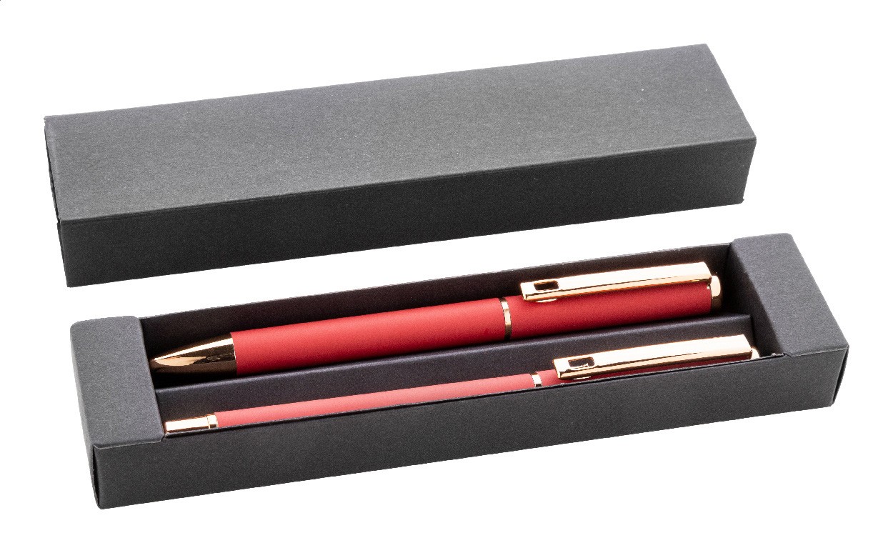 Set pixuri din aluminiu reciclat, cu pix cu bilă și roller, cu finisaj cauciucat și detalii auriu-roz. Cu mină albastră. Cu strat special pentru gravare laser în oglindă, de culoare auriu-roz. În cutie cadou din hârtie neagră.