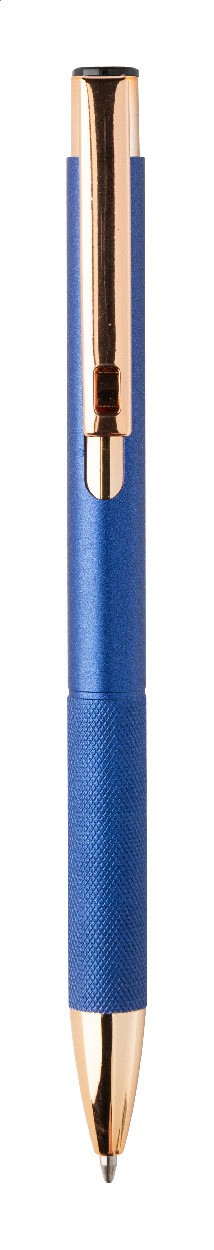 Pix din aluminiu reciclat, cu corp cu finisaj mat, grip texturat și detalii auriu-roz. Cu strat special pentru gravare laser în oglindă, de culoare auriu-roz. Cu mină albastră.