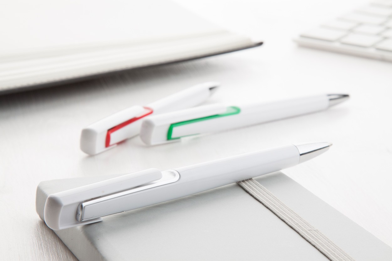 Pix din plastic cu accesorii colorate şi vârf cromat. Cu mină albastră.