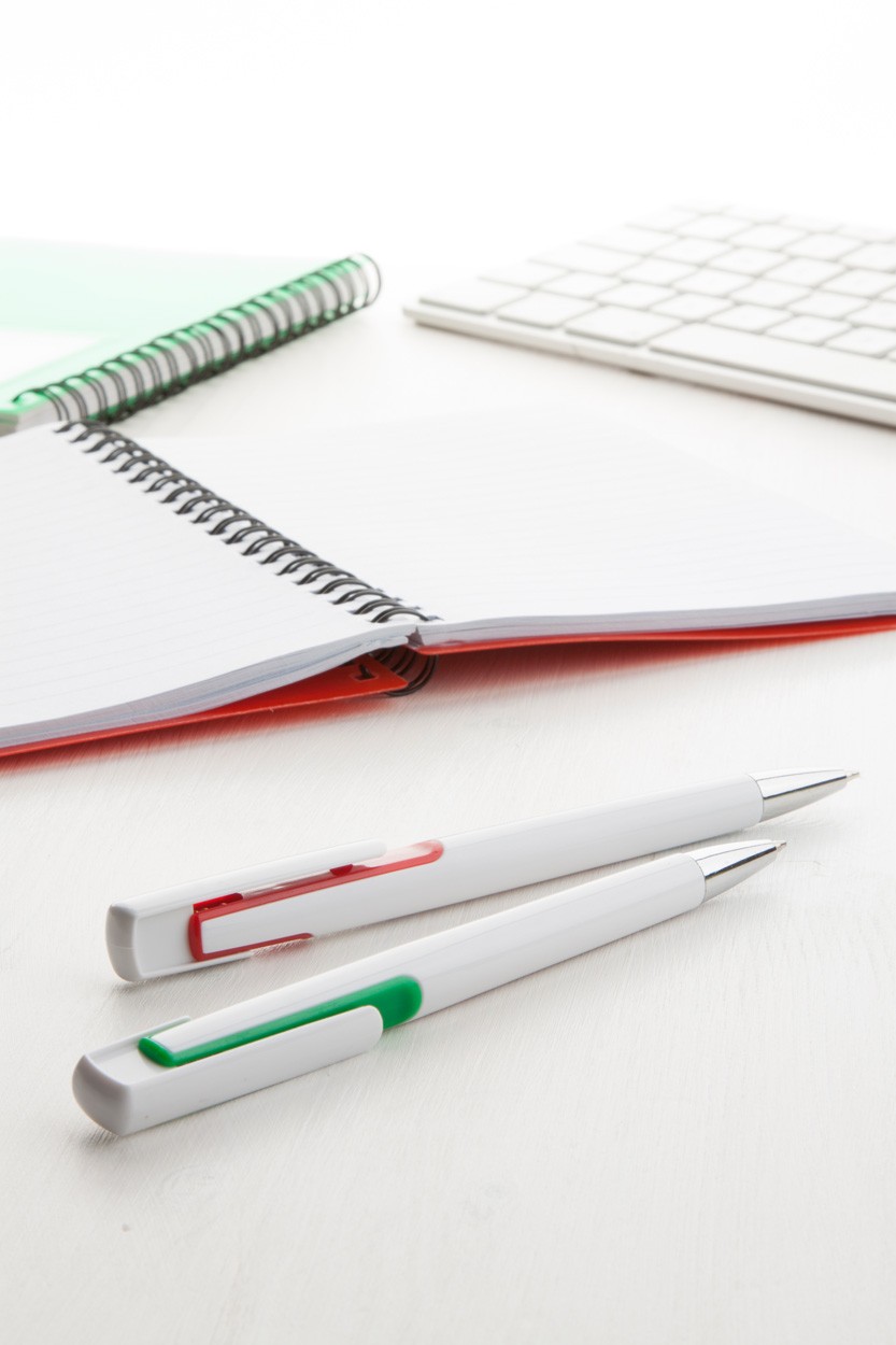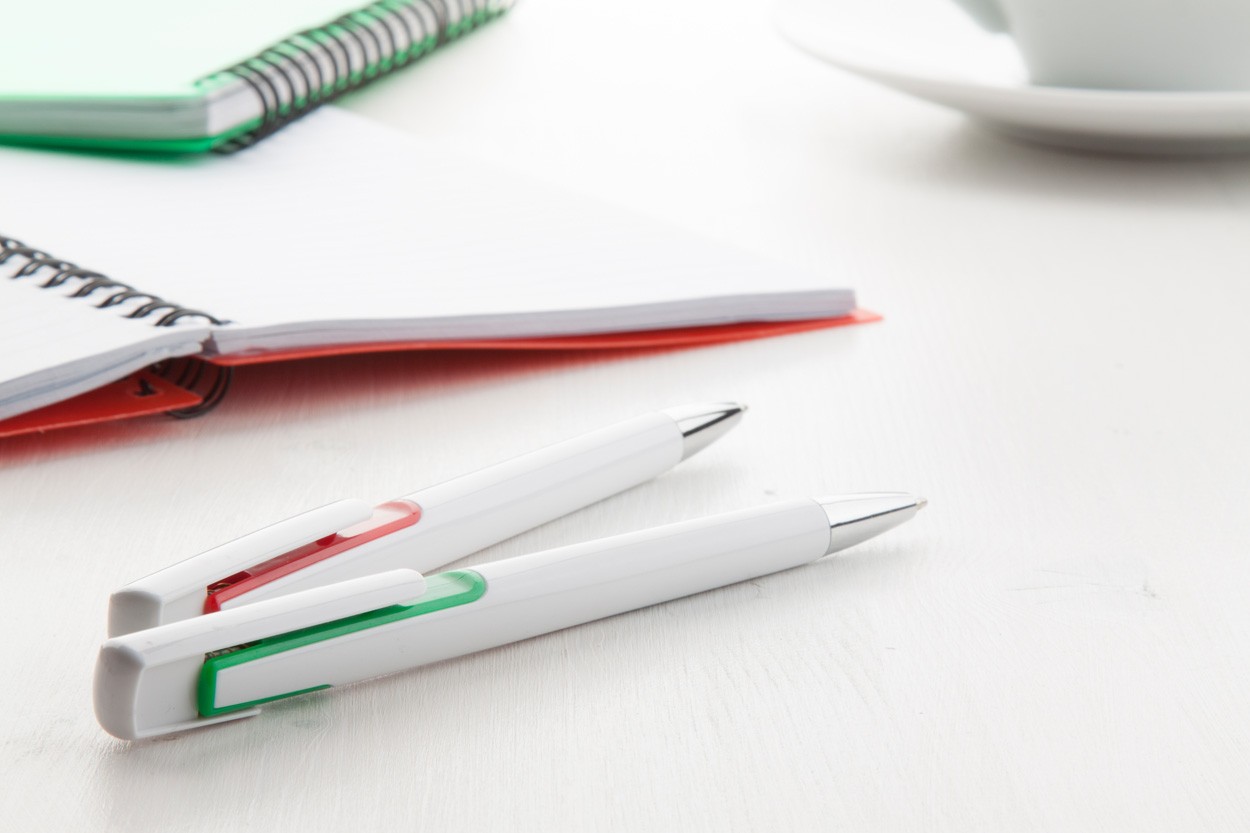 Pix din plastic cu accesorii colorate şi vârf cromat. Cu mină albastră.