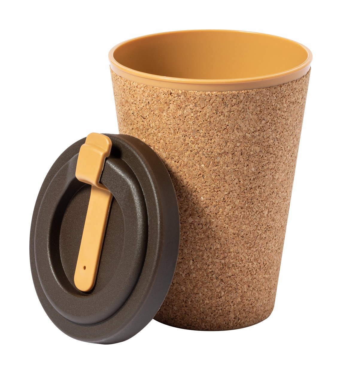 Cană termică, din plastic PP, cu perete dublu acoperit cu plută naturală, cu capac de băut, 350 ml. Fără BPA