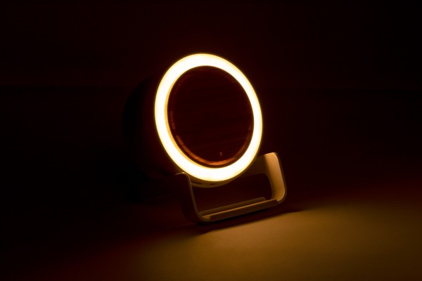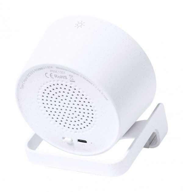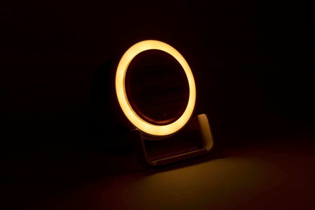 Lampă de birou multifuncțională, din plastic din bambus și paie de grâu. Cu 12 LED-uri, 3 moduri de lumină și luminozitate reglabilă. Cu difuzor bluetooth încorporat și încărcător rapid wireless (10W). Inclusiv cablu de încărcare USB-C. În cutie cadou. Produs Limited Edition.