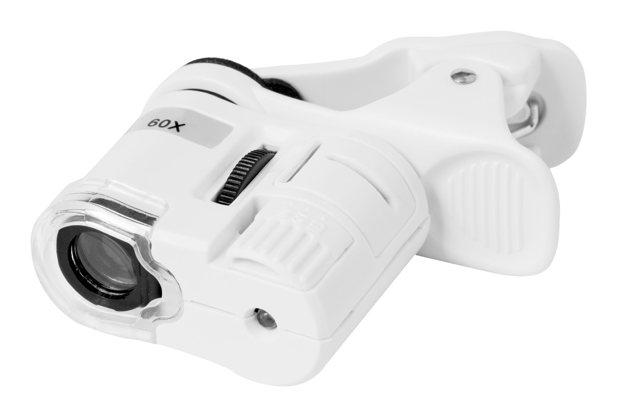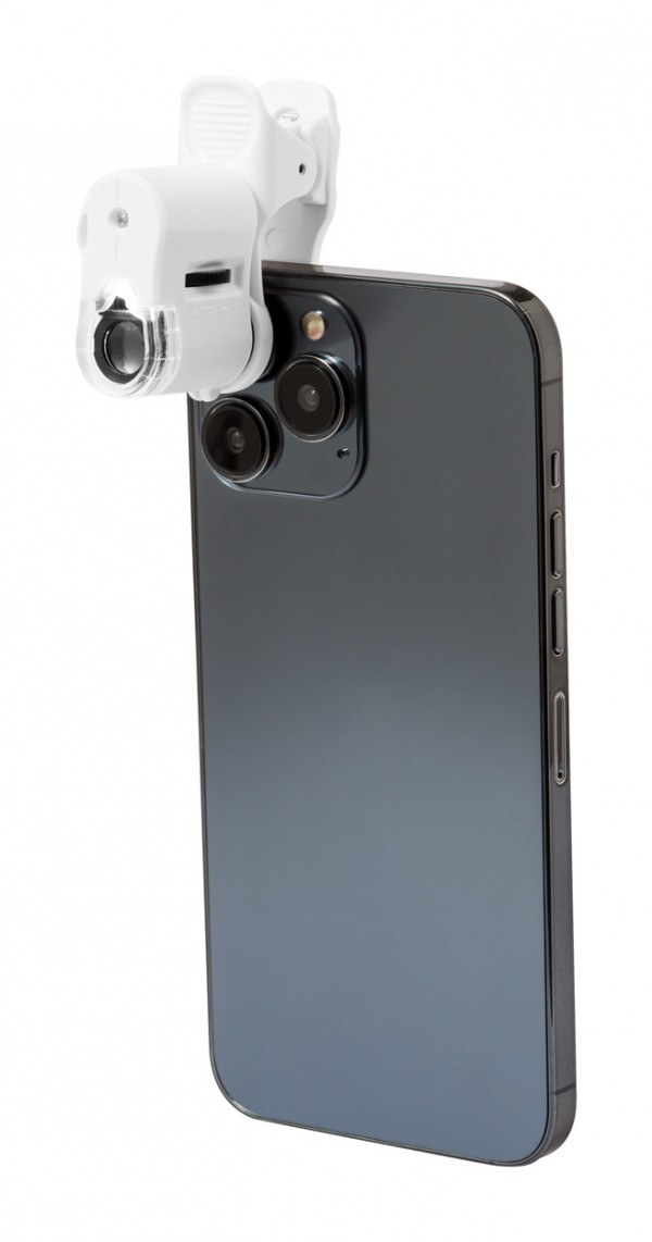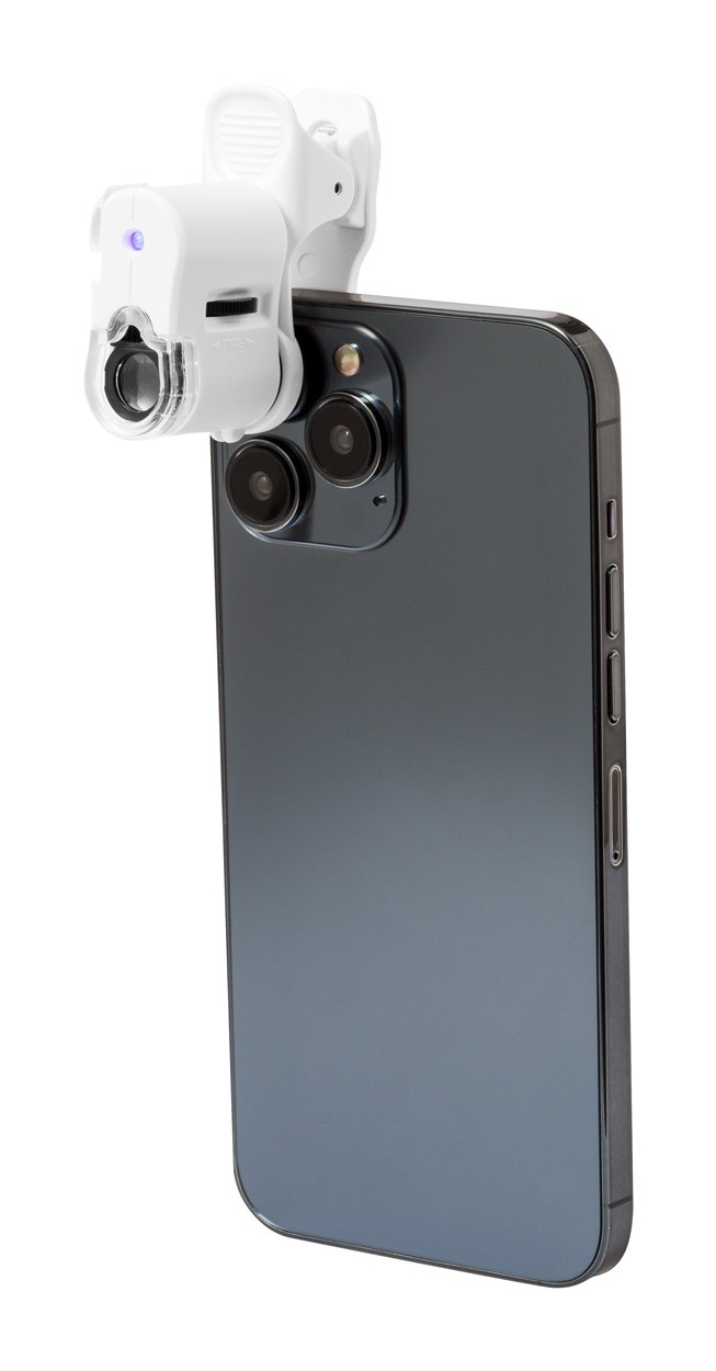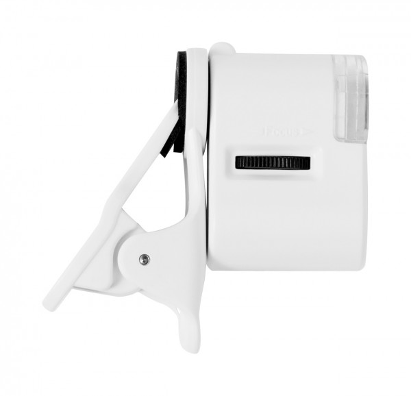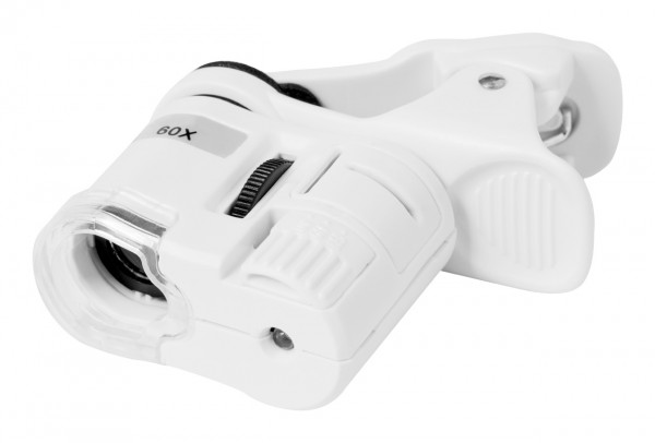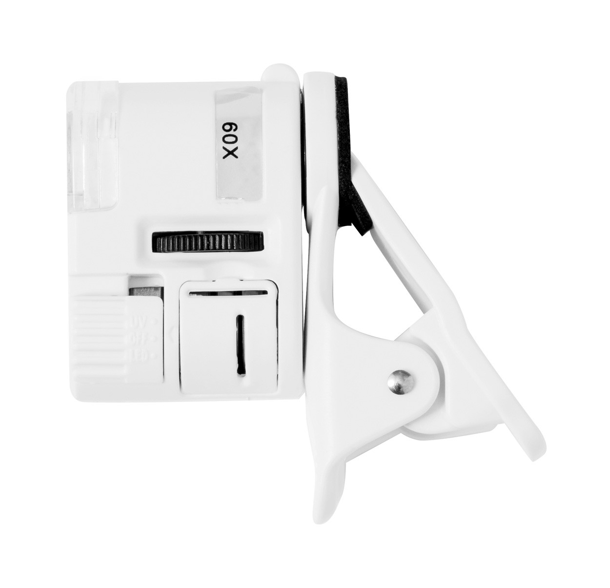 Adjustable, ABS plastic pocket microscope with clip for mobiles and 2 LEDs. Including button cell batteries. In polyester pouch.