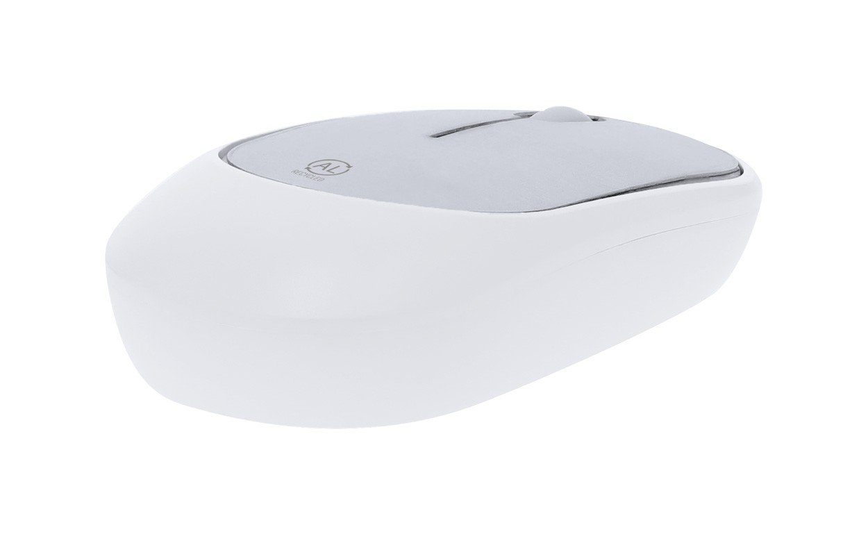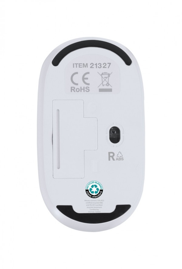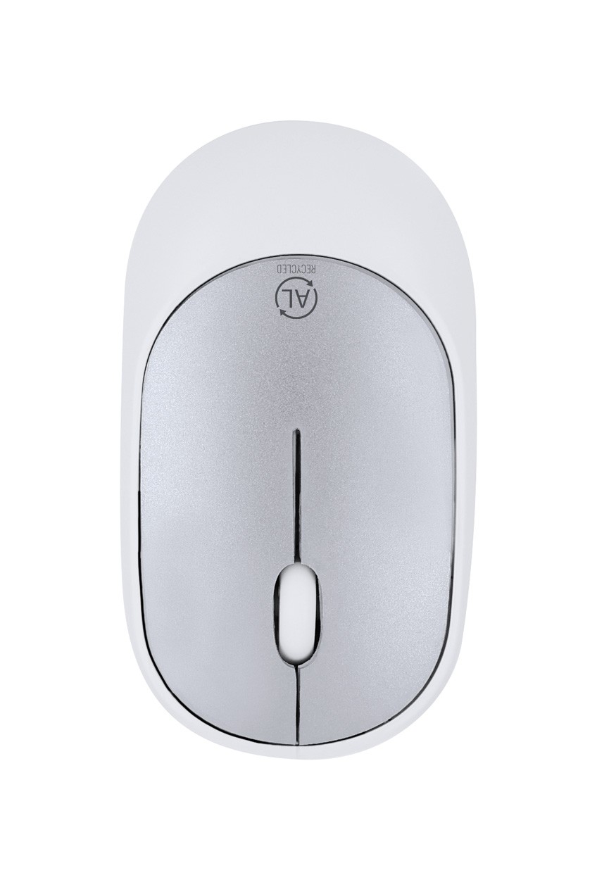 Mouse optic fără fir, din plastic ABS reciclat și carcasă din aluminiu reciclat. Funcționează cu baterie 1AA, livrat fără baterie.