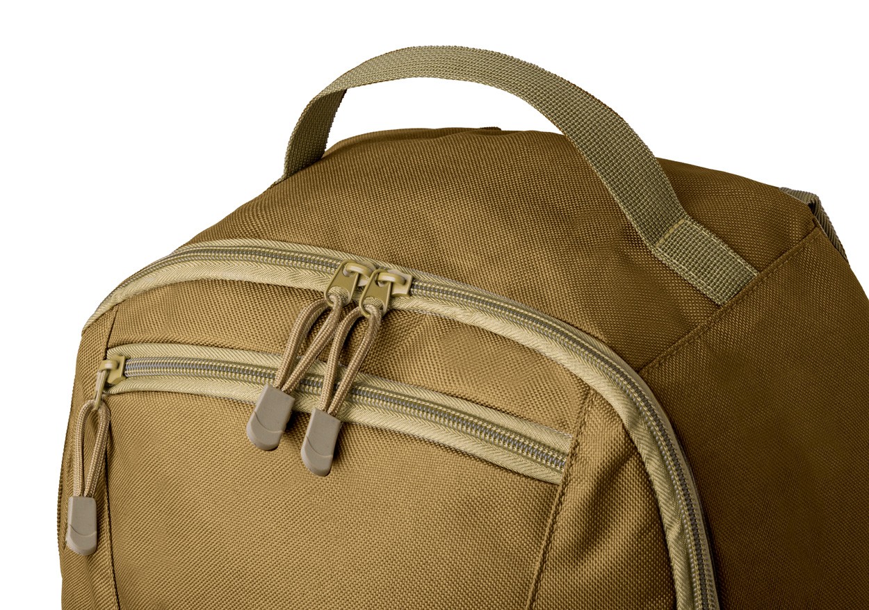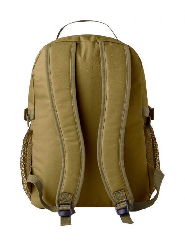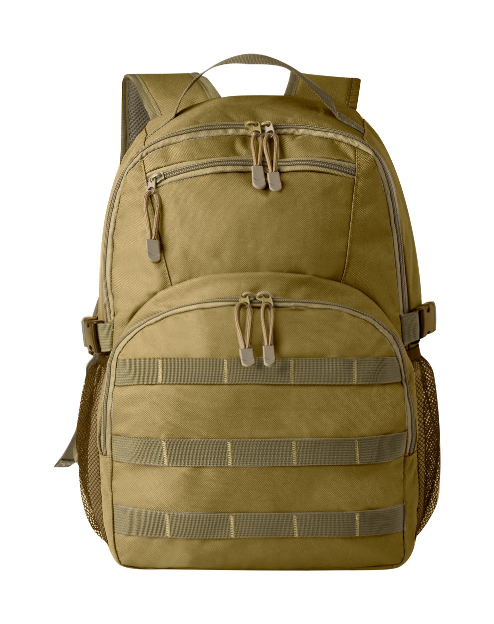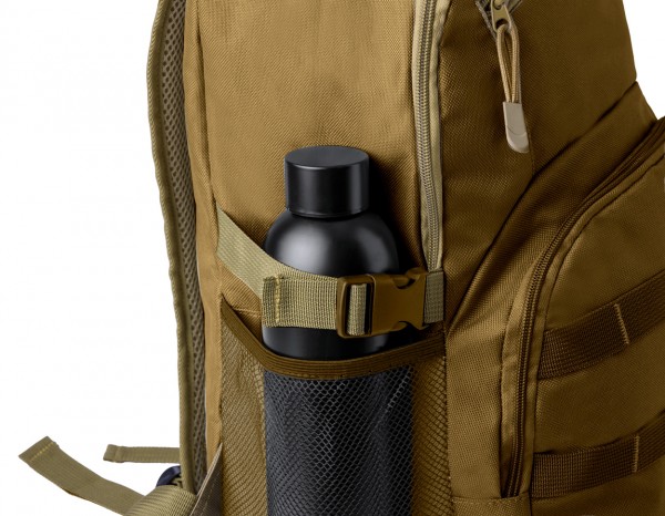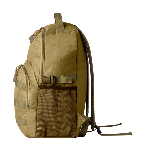 800D polyester backpack with zipped compartments, side mesh pockets, elastic accessory holders, padded back and shoulder straps.