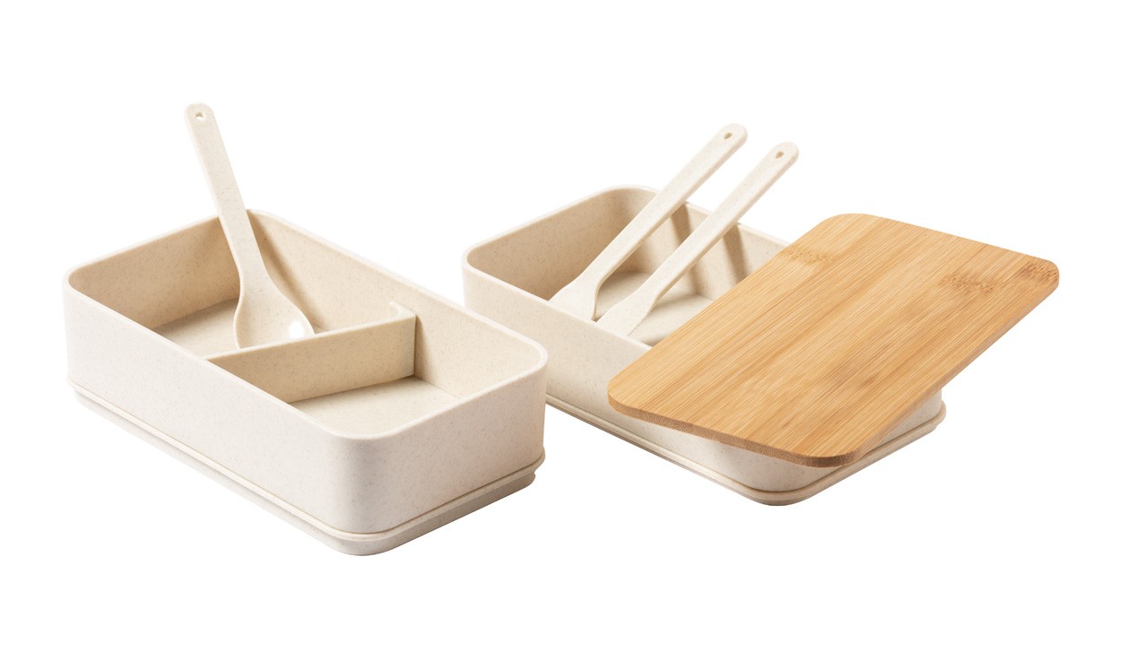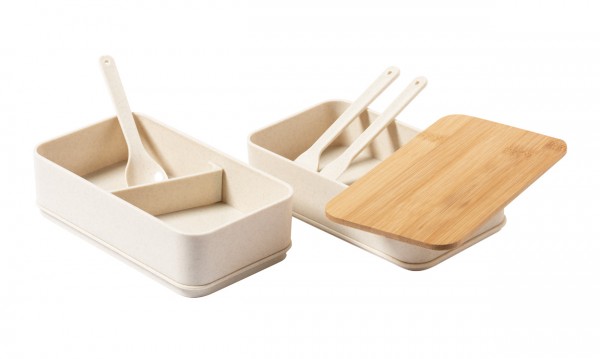 Cutie de prânz din plastic PP cu set de tacâmuri (furculiță, lingură și cuțit), capac din bambus și curea elastică. Cu 2 compartimente cu o capacitate de 700 ml fiecare.