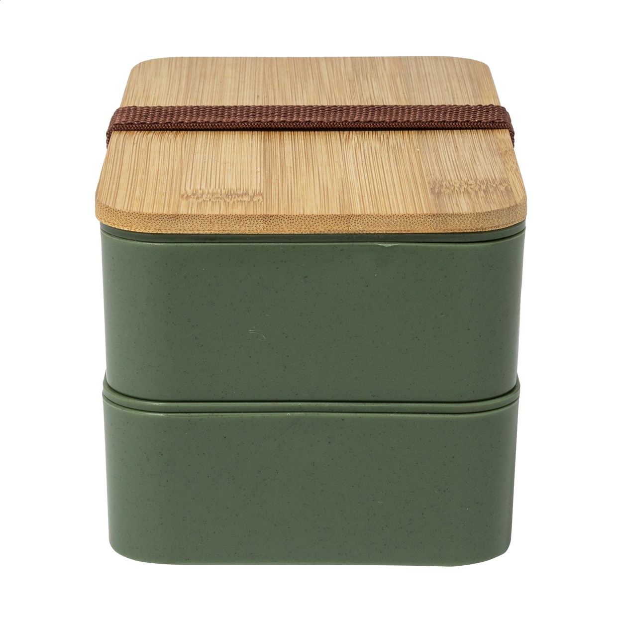 Cutie de prânz din plastic PP cu set de tacâmuri (furculiță, lingură și cuțit), capac din bambus și curea elastică. Cu 2 compartimente cu o capacitate de 700 ml fiecare.