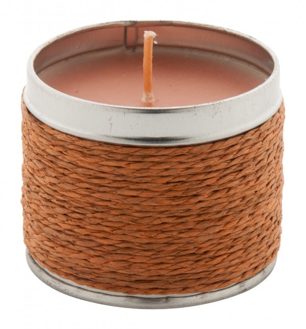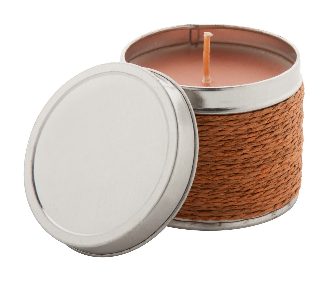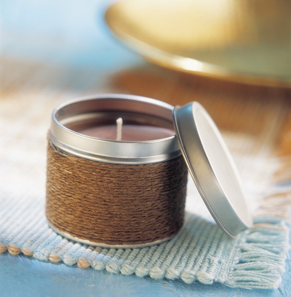 Lumânare parfumată, in cutie metalica cu decoratii din sfoara.