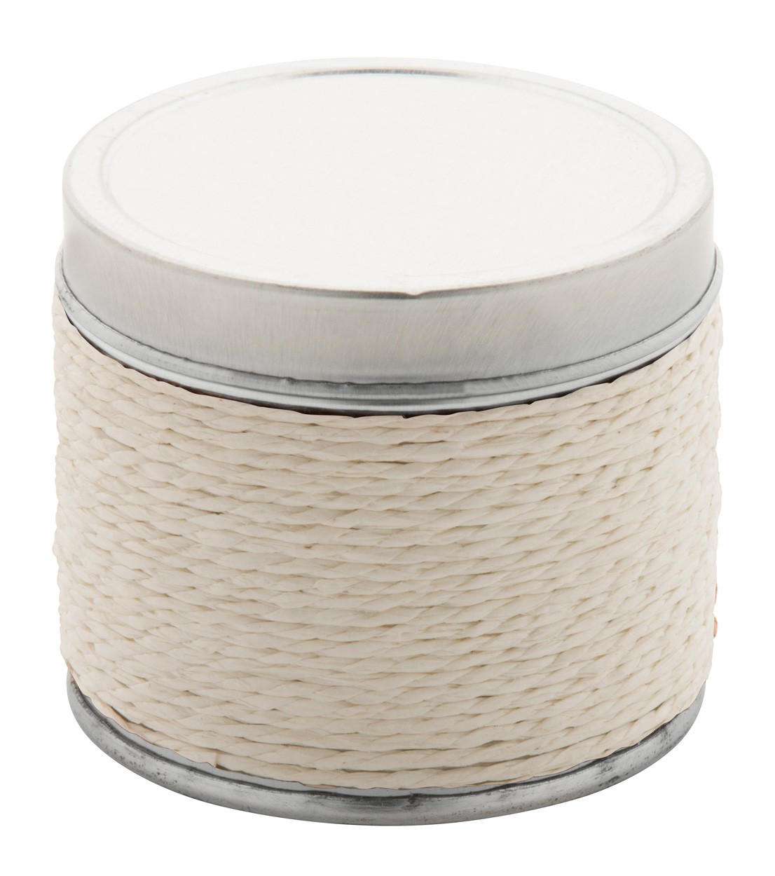 Lumânare parfumată, in cutie metalica cu decoratii din sfoara.