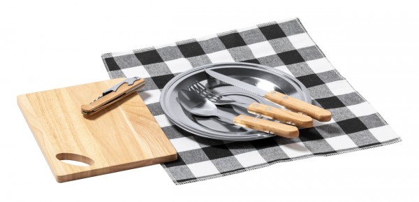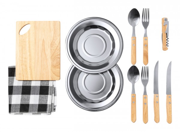 Set pentru picnic, 12 bucăți, tacâmuri pentru 2 persoane, în husă de transport din bumbac cu fermoar. Include 2 seturi de tacâmuri, 2 farfurii, 2 șervețele de pânză, tirbușon și tocător.