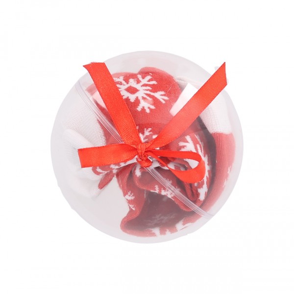 Pereche de șosete de Crăciun, din poliester. În minge transparentă cu panglică roșie.