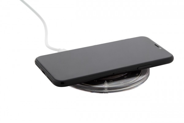 Încărcător rapid fără fir (15W), din plastic transparent și carcasă din bambus cu componente electronice vizibile. Inclusiv cablu de încărcare USB.